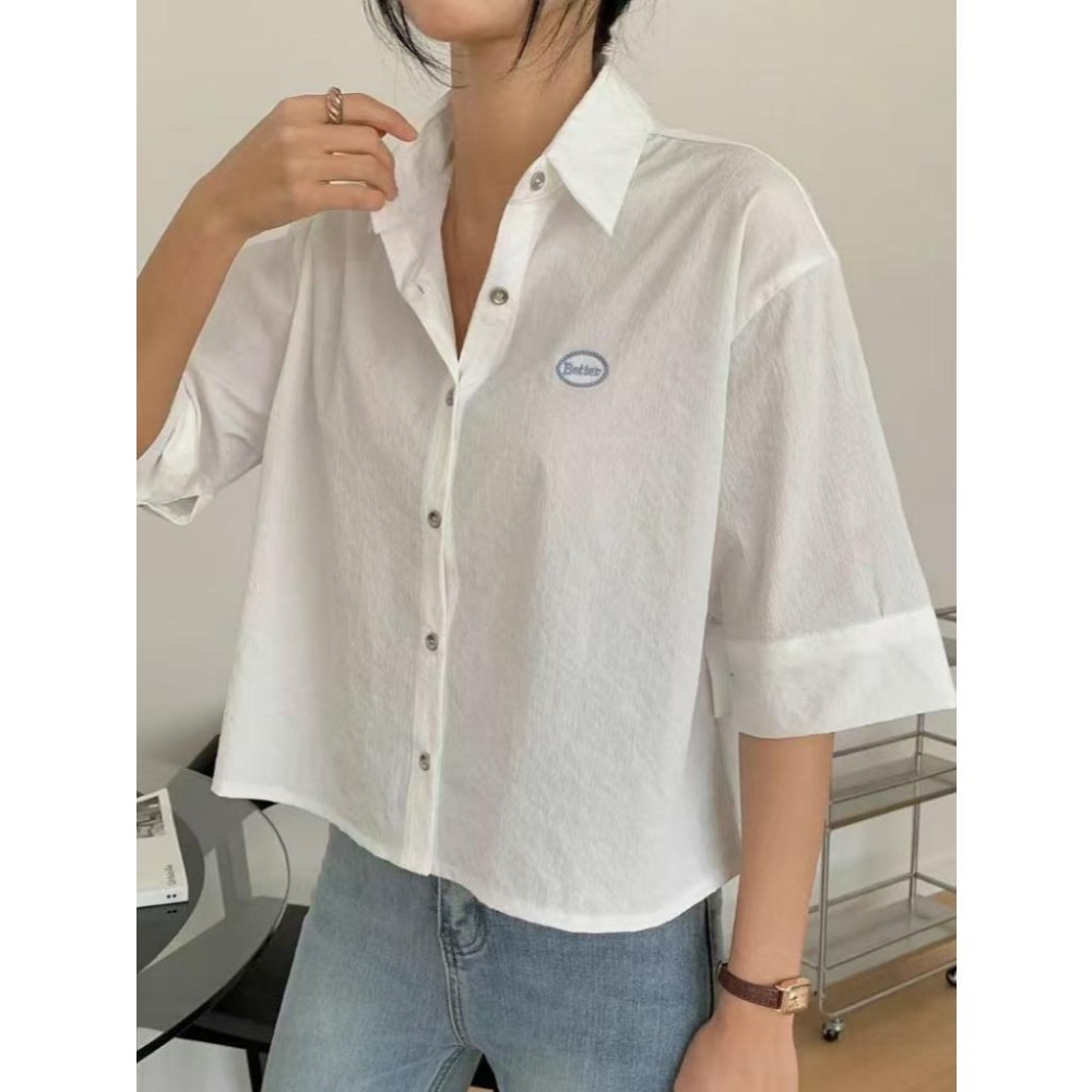 ▶ 產品:刺繡七分袖條紋半短版襯衫