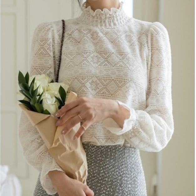 【中領氣質】VENUSY|正韓🇰🇷 - 韓國東大門空運直送台灣|柔軟羊毛半領蕾絲上衣 T恤