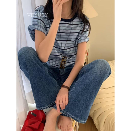 【美式復古・拼色條紋】VENUSY|正韓 - 寬鬆拼色條紋短袖T恤.100%純棉.紅/卡其/天藍.必備基本款