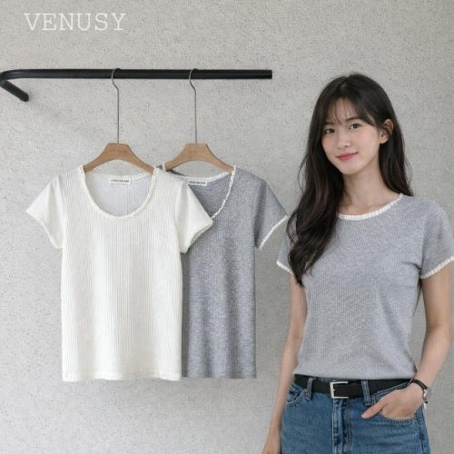 【雲朵彈力】VENUSY|正韓 - 小花邊修身短袖T恤.象牙白/灰.極致親膚