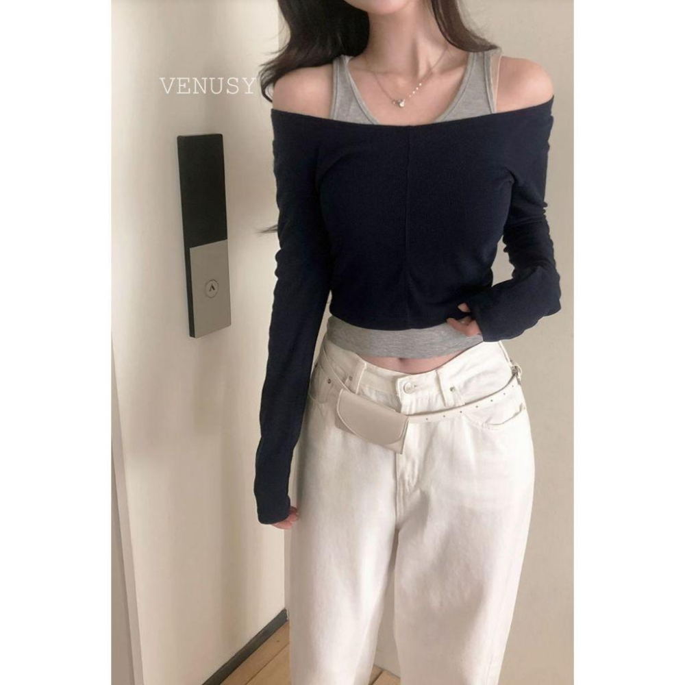 【層疊美學・視覺直角肩】VENUSY|正韓 - 露肩羅紋假兩件上衣.修身彈力面料.春夏必備設計款