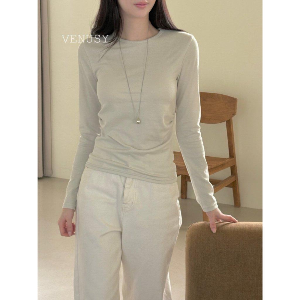 【雲感彈力・法式優雅】VENUSY|正韓 - 側皺褶彈力修身長袖T恤.天空藍/嫩綠/粉.春夏顯瘦必備