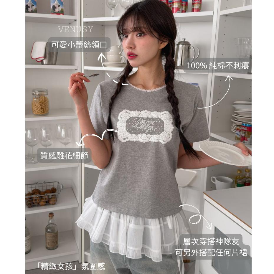 【100%純棉.透氣不刺癢】VENUSY|正韓 - 蕾絲領口純棉短袖T恤.精緻鏤空花紋.修身顯瘦版型