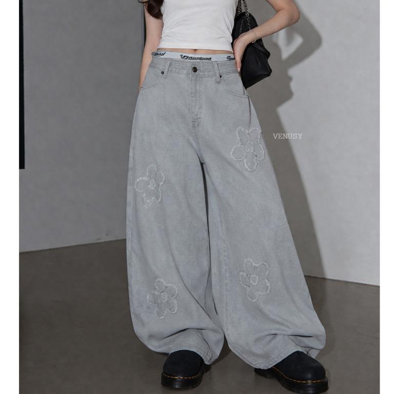 【可愛酷颯.100%純棉】VENUSY|正韓 - 小花立體刺繡氣球長褲.休閒高級感.慵懶灰色.S-L