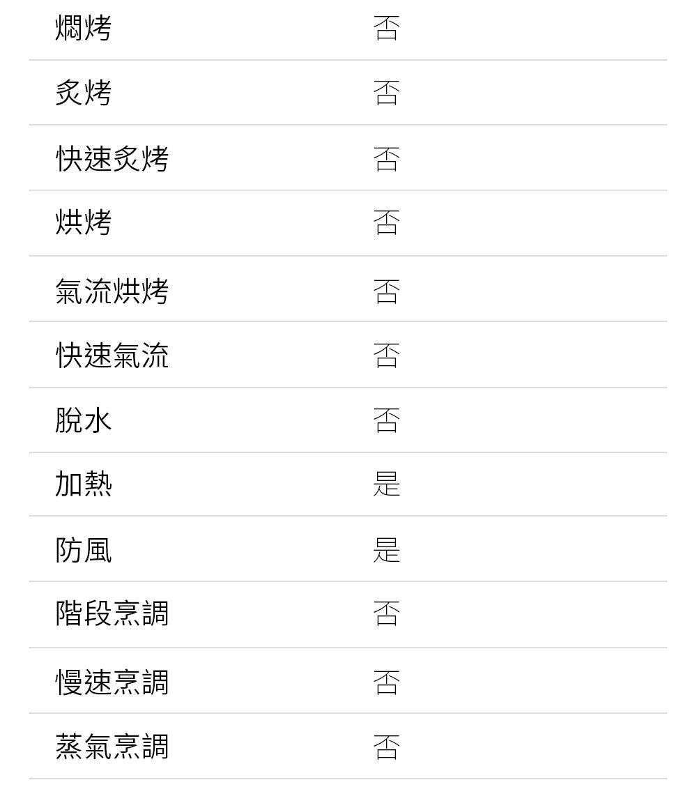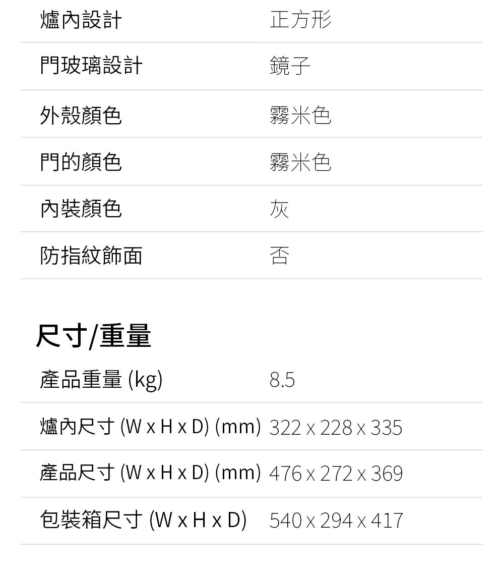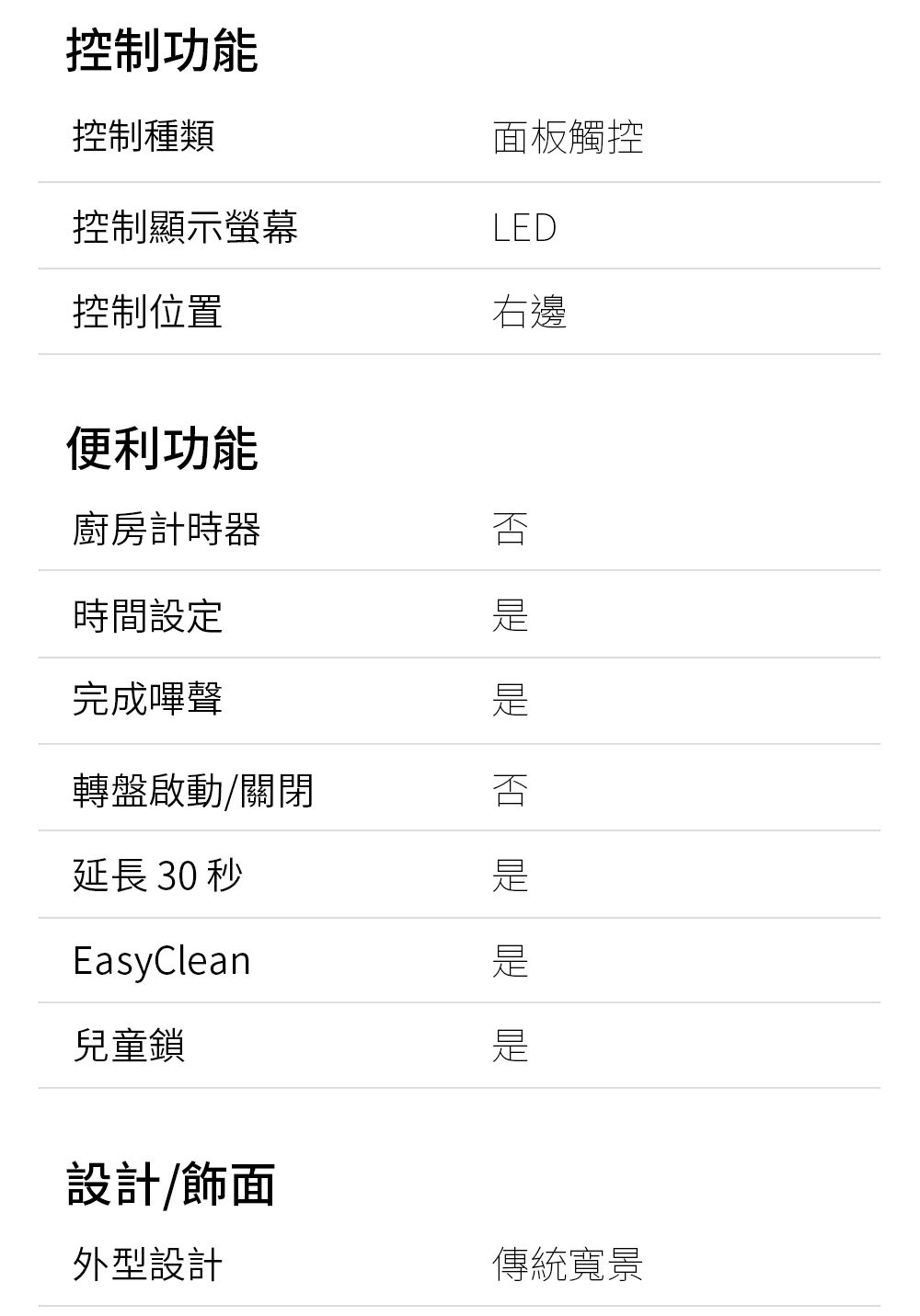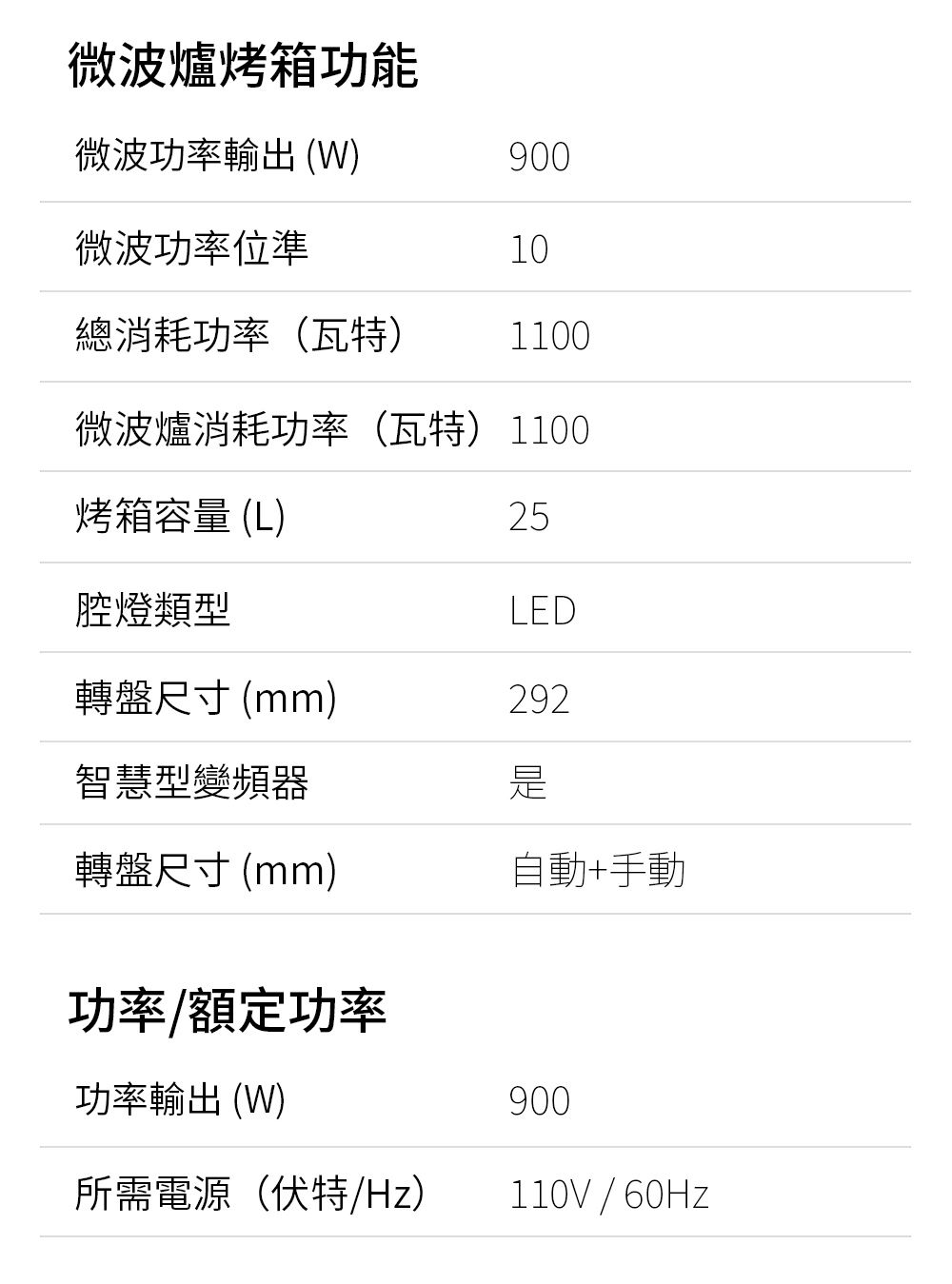 ◎基本規格 爐門設計:分離式 顏色:霧米色 操作面板類型: 面板觸控 容量:25公升 內部尺寸 (寬 x 高 x 深):322 x 228 x 335 mm 外部尺寸 (寬 x 高 x 深):476 x 272 x 369 mm 轉盤尺寸:292mm 重量:8.5kg 電源輸入:100V / 60Hz ◎消耗功率 輸出功率 (M/W):900W 微波功率位準:10 總額定消耗電功率:1100W ◎功能 定時:是 兒童安全鎖:是 增/減 時間:是 商檢字號:R3A062