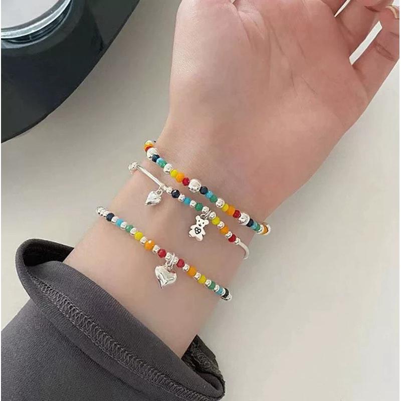 心飾Acc🇰🇷快速出貨「925純銀手鍊 s925彩虹愛心小熊銀珠純銀手鍊 彈力繩手鍊 韓國 彩虹串珠