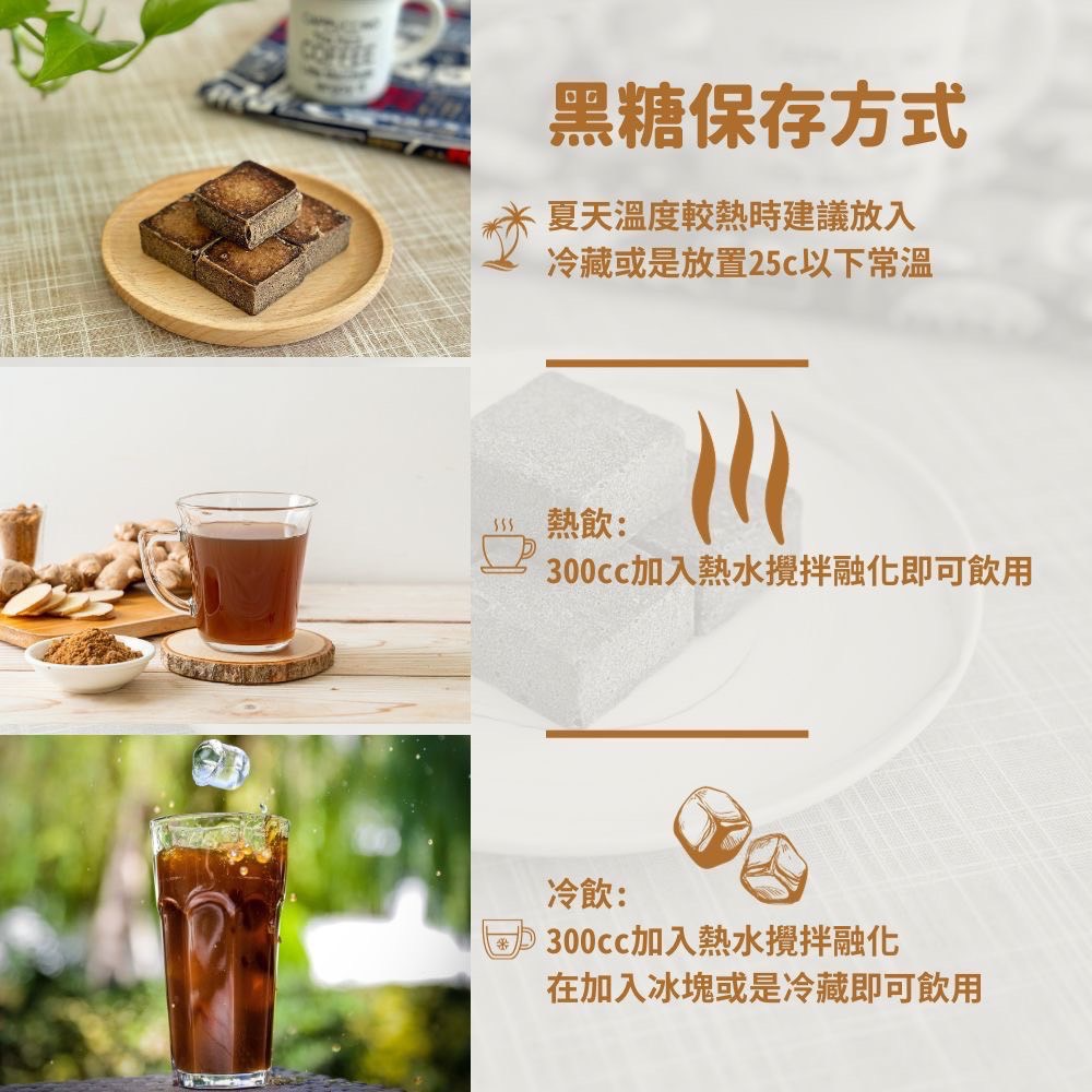 使用方法:將黑糖塊搭配熱開水沖泡200cc,濃度可依個人口味作調整