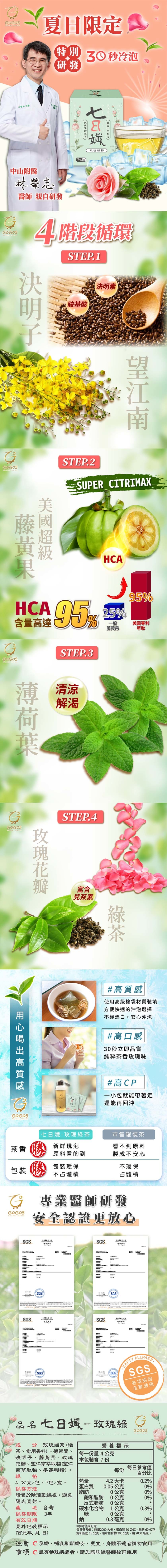 成分:玫瑰綠茶、薄荷葉、決明子、藤黃果、玫瑰花瓣、望江南萃取物(望江南萃取物、麥芽糊精) 容量:4公克/包,7包/盒 鑑驗內容:SGS多項檢驗 有效期限:見外包裝標示(西元年.月.日) 保存期限:3年 產地:台灣 食用方式:每日1-2包,以300-600c.c水量沖泡,可依個人喜好增減水量,調整濃淡 保存方式:請置於陰涼乾燥處,避免陽光直射 注意事項: 1.孕婦、哺乳期間婦女、兒童、身體不適者請勿食用 2.患有特殊疾病者,請先諮詢過醫師後再使用 3.純素 4.含綠茶成份含咖啡因