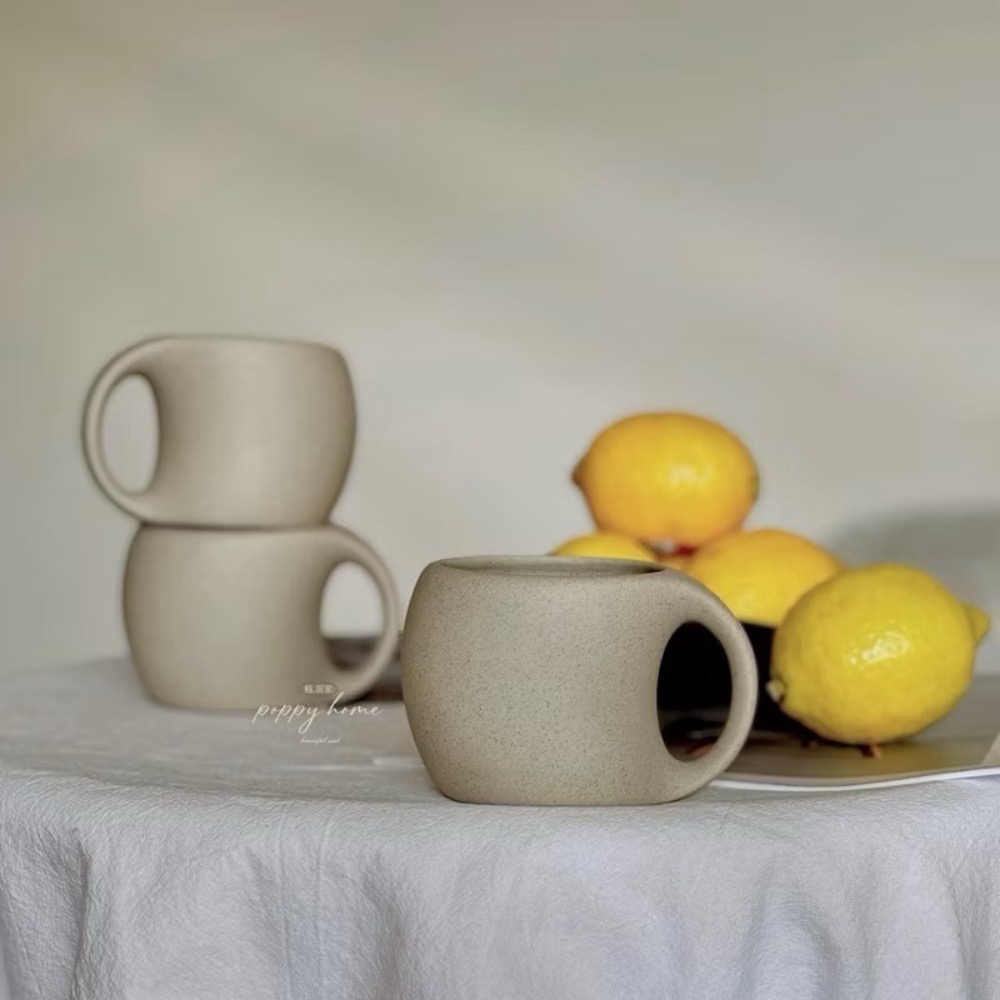 杯子是瓷質的,採用仿粗陶工藝,磨砂質感,整體簡潔大氣