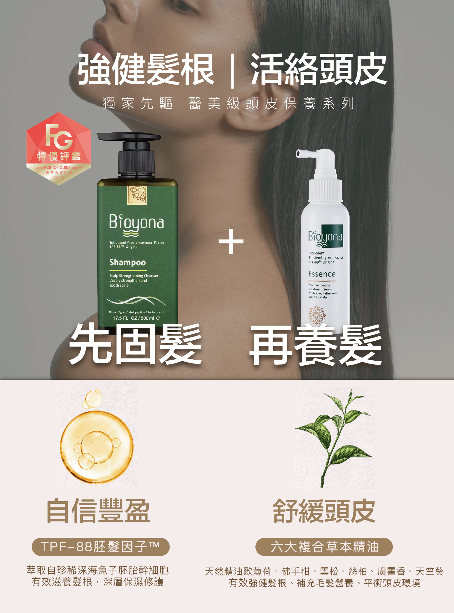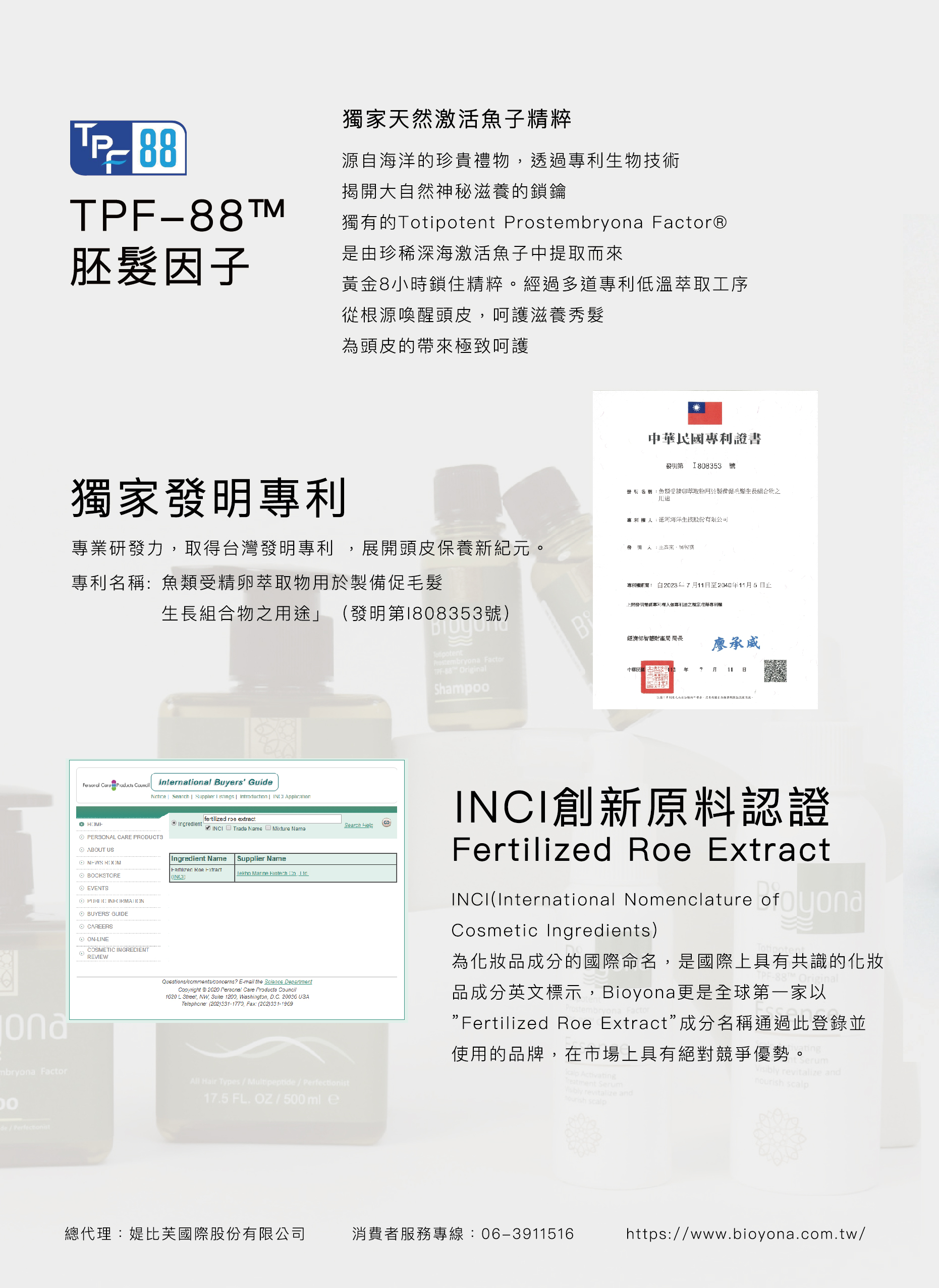 添加獨家專利主成分「TPF-88胚髮因子 」,是魚子胚胎幹細胞的生長胜肽精華,有極佳的導入作用深入肌底,達到活化頭皮肌膚的功效,更加強頭皮護理、對抗老化,增加毛囊復甦活力。