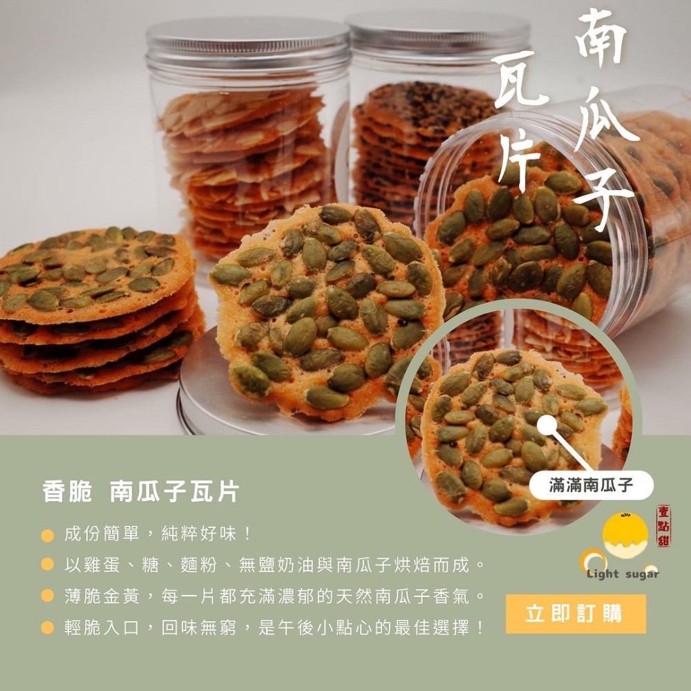 以雞蛋、糖、低筋麵粉、無鹽奶油與南瓜子烘焙而成,薄脆金黃,每一片都充滿濃郁的天然南瓜子香氣。輕脆入口,回味無窮,是午後小點心的最佳選擇!