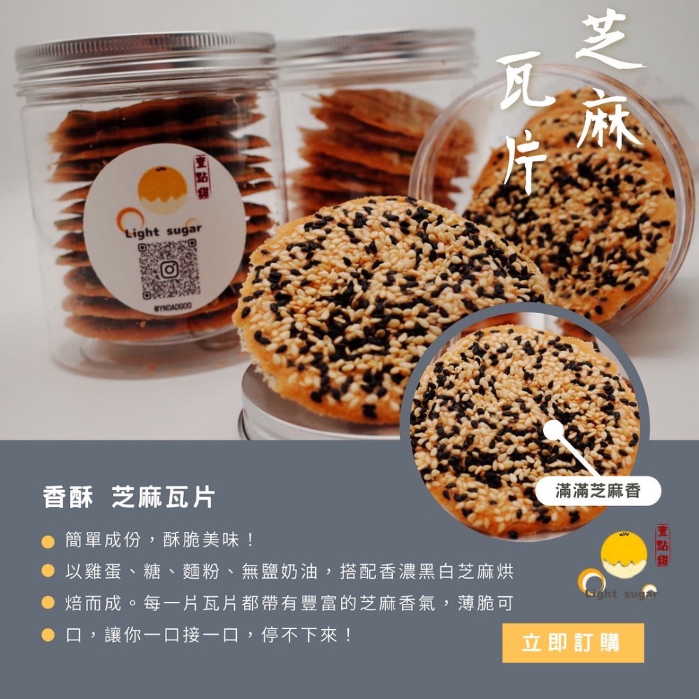 以雞蛋、糖、低筋麵粉、無鹽奶油,搭配香濃黑白芝麻烘焙而成。每一片瓦片都帶有豐富的芝麻香氣,薄脆可口,讓你一口接一口,停不下來!是你輕鬆愉悅的最佳零嘴!