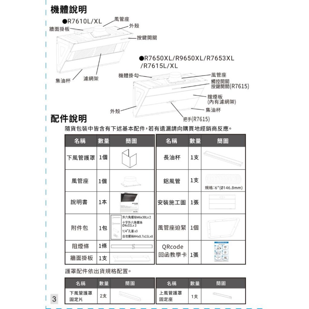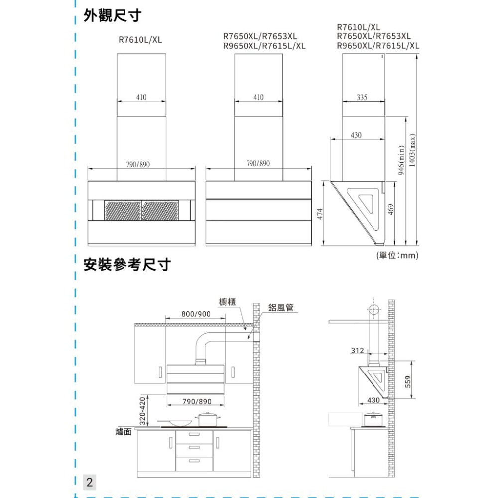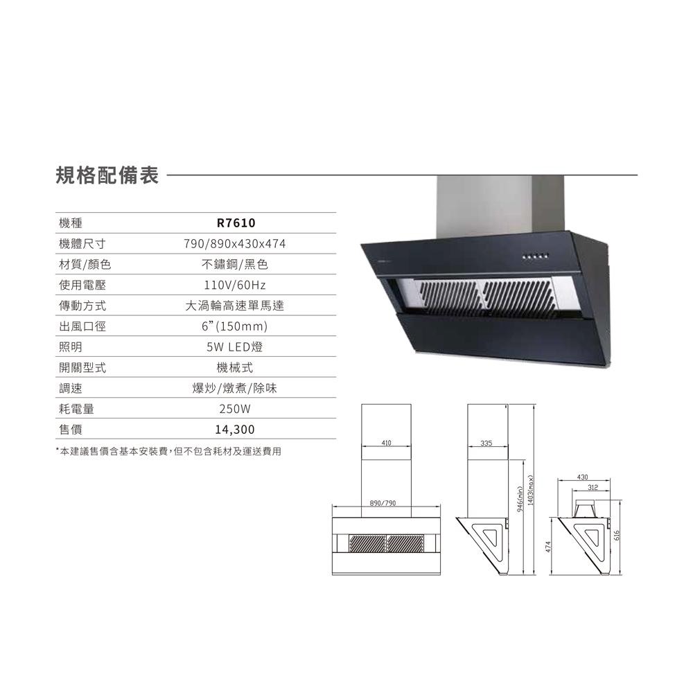 ★新型近吸排風結構,近吸直吸秒排煙 ★大風機增壓馬達,龍捲大吸力暢排煙 ★易拆磁吸式油網,省時輕巧好刷洗 ★全鋼化黑玻璃,一抹即淨好省心 ★完美傾斜度,釋放烹飪視線不碰頭 ★永久免費送油網,確保吸力永如新 機種:R7610L(80CM)/R7610XL(90CM) 機體尺寸(寬×深×高)mm:(80CM)790x430x474/(90CM)890x430x474 機體含護罩尺寸(寬×深×高)mm:410×330×1403 (上風管尺寸477/下風管尺寸477) 顏色/材質:黑色/不鏽鋼 重量(kg):26kg/28kg 使用電壓:110V/60Hz 傳動方式:AC大風機馬達 出風口徑:6"(Φ150mm) 照明:LED燈5W x1 開關型式:機械式開關 調速:3速(爆炒/燉煮/除味) 一米圓形排煙管排風量(m3/min):16.5 備註:2019年1月起,依CNS3805法規調整除油煙機風量標示說明,詳情內容請點我。 BSMI:R51085