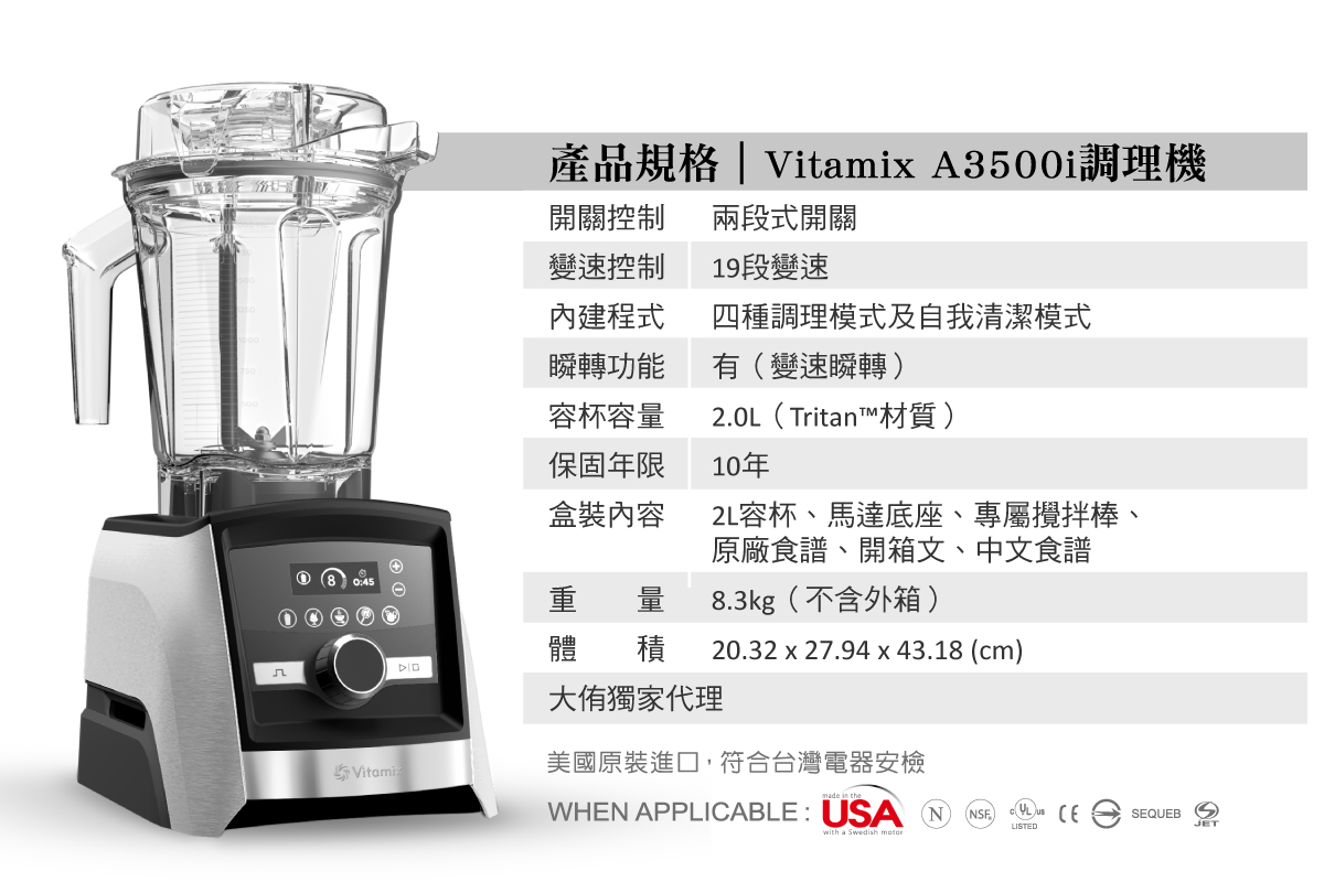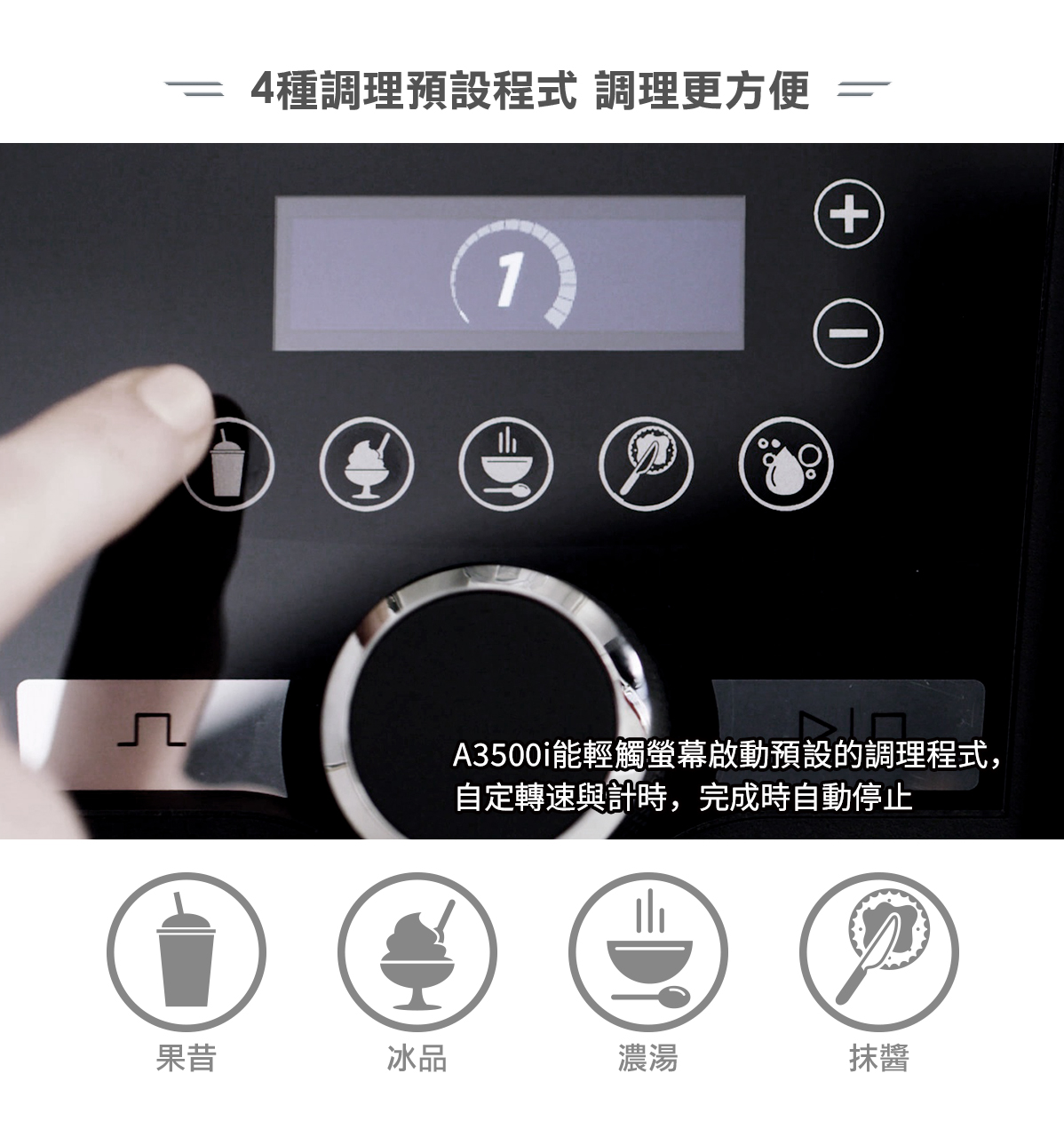 - 搭配不鏽鋼髮絲紋的時尚外觀,使用A3500i調理機的您,展現過人品味