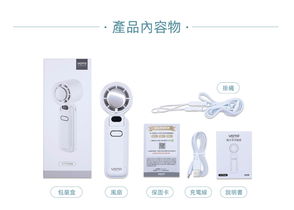 商品內容物 : 說明書、保固卡、風扇、USB充電線 、掛繩