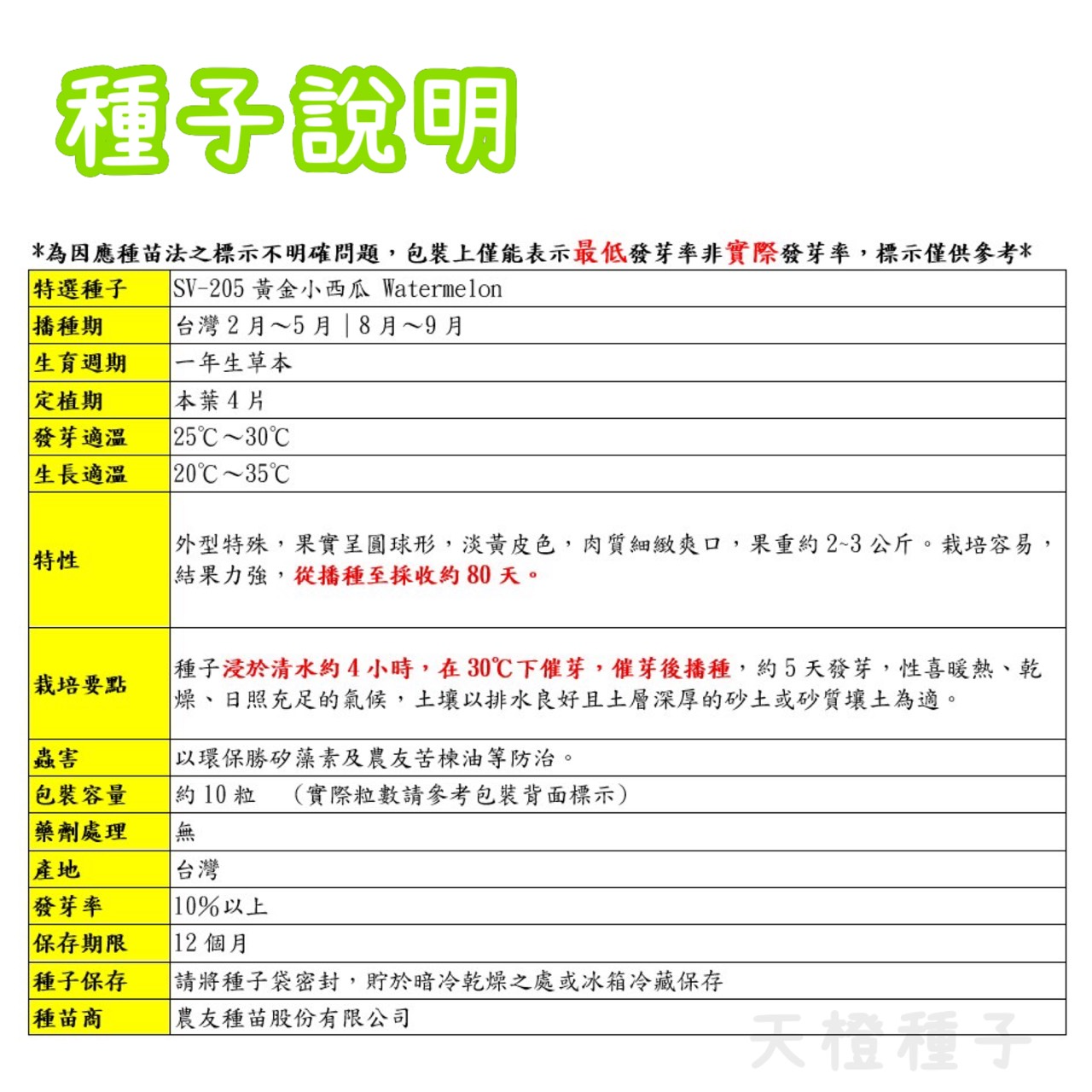 【天橙種子】黃金小西瓜種子 SV-205 約10粒 特選種子 水果類種子 農友種苗 家庭園藝 彩色原包裝