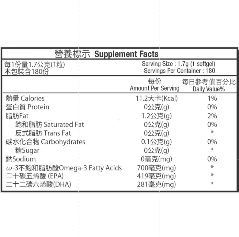 每粒添加二十碳五烯酸(EPA) 419毫克、二十二碳六烯酸(DHA) 281毫克