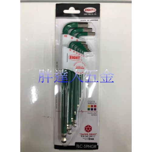 胖達人五金 日本 EIGHT TLC-S9NGR 八尾牌 彩色 白金 多角球型 六角 板手組 9支組 綠色 公制 六角