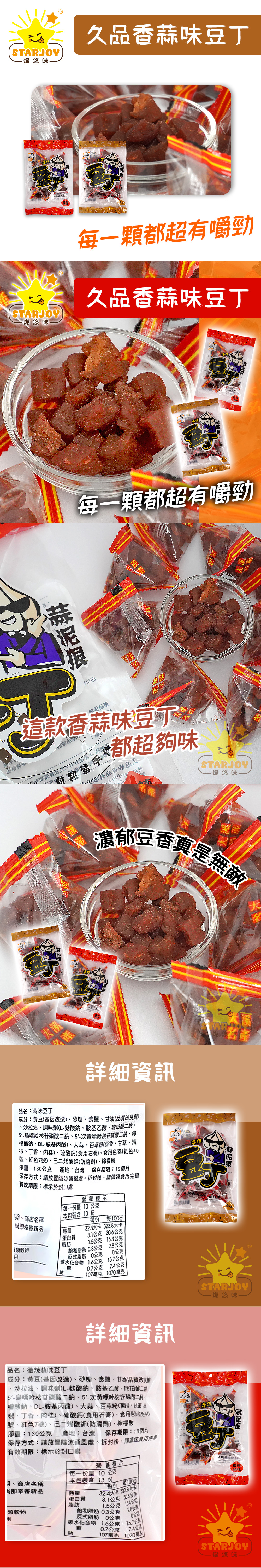 🫘 久品香蒜味豆丁 🧄 豆干控的日常幸福小零嘴來啦! 不管是 原味 還是 微辣, 這款香蒜味豆丁都超夠味~ 🌟 三大亮點直接說給你聽: 1️⃣ 香氣逼人 蒜香直衝鼻腔, 咬下去那個濃郁豆香真是無敵~ 2️⃣ Q彈口感 每一顆豆丁都超有嚼勁, 越咬越香,超適合邊看劇邊嗑~ 3️⃣ 微辣挑戰 想來點小刺激?試試微辣口味, 香辣過癮,完全停不下來! 💡 袋裝方便,隨身零嘴必備! 130g一袋,份量剛剛好, 無論是自己獨享還是跟朋友分享,都超適合!