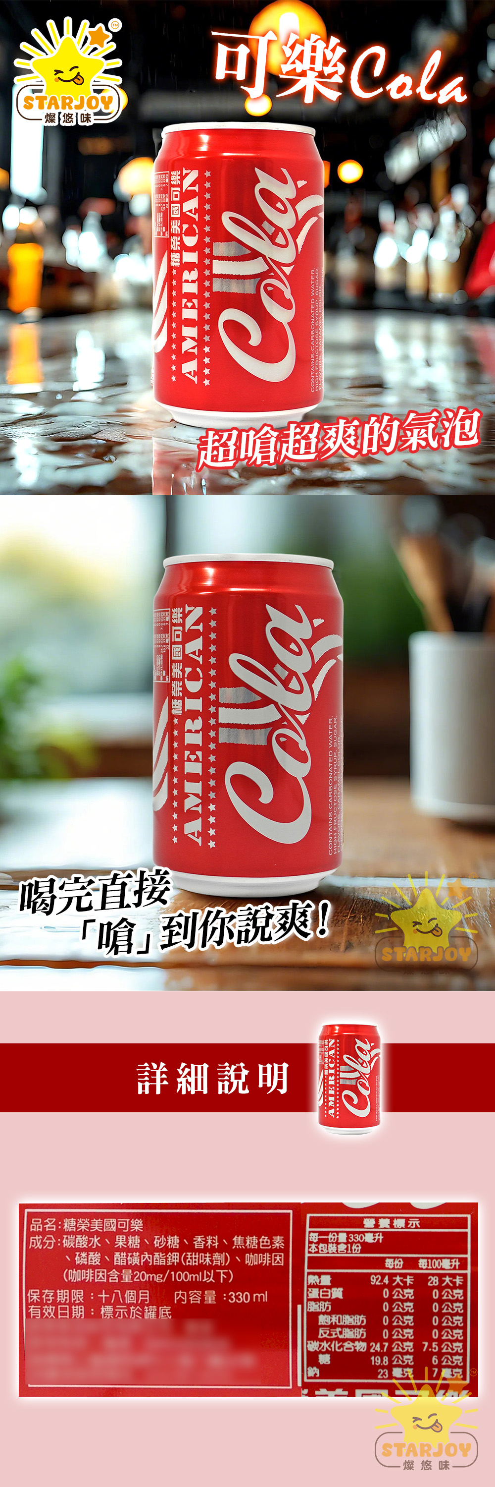 🥤糖榮美國可樂Cola 🥤 欸~這款糖榮美國可樂真的經典到爆! 喝一口,直接被那超嗆超爽的氣泡擊中! 😆✨搭配濃郁的可樂香,無論是配炸雞、 披薩還是零食,怎麼喝都過癮~🍕🍗 ✨ 必喝亮點 ✨ ✔️ 濃郁可樂風味: 每一口都是美式經典滋味~ ✔️ 強力氣泡感: 喝完直接「嗆」到你說爽! ✔️ 全場最佳搭檔: 餐桌、派對、追劇都少不了它! 不管是聚會狂歡還是午後偷閒, 來一罐 糖榮美國可樂, 快樂無負擔,氣泡讓生活更有趣! 😎✨ 快揪朋友來開罐乾杯吧~ 🥂