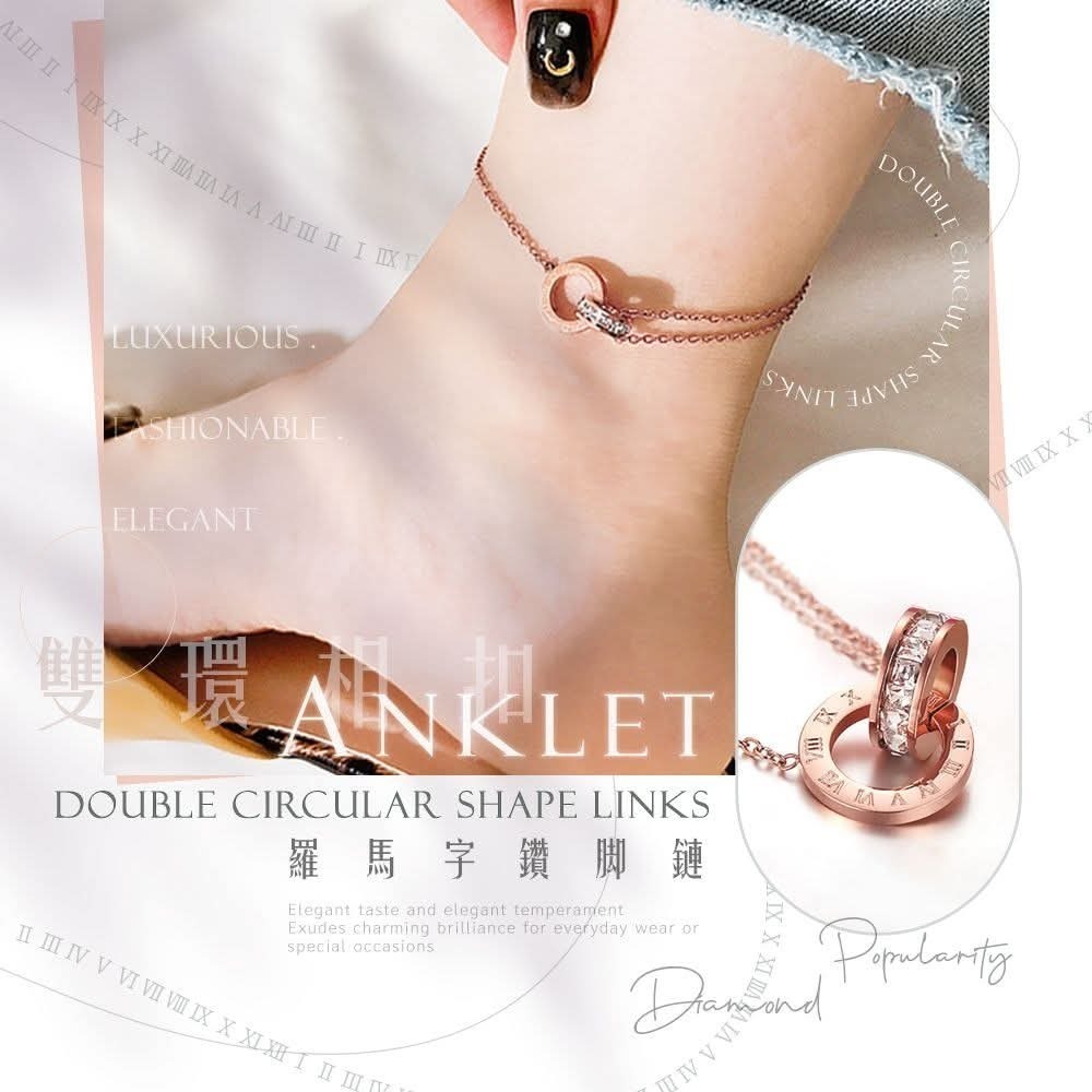 配戴這款✨雙環相扣羅馬字鑽腳鍊✨
