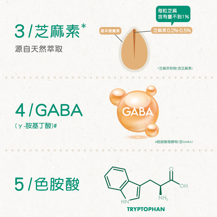 ▸ 益生菌、芝麻素、GABA添加