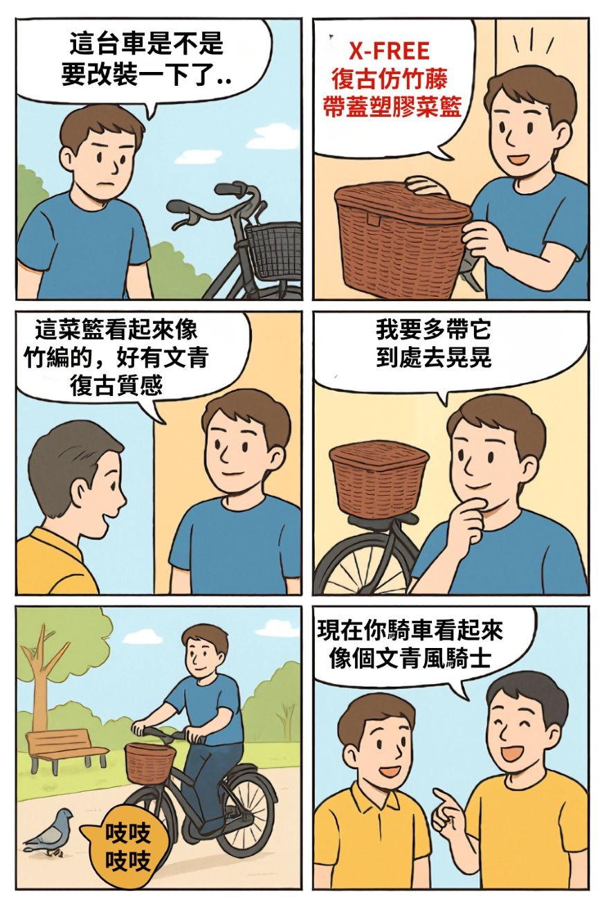直到某天他裝上了「X-FREE復古仿竹藤帶蓋車籃」,整台車瞬間升級成「懷舊文青款」。