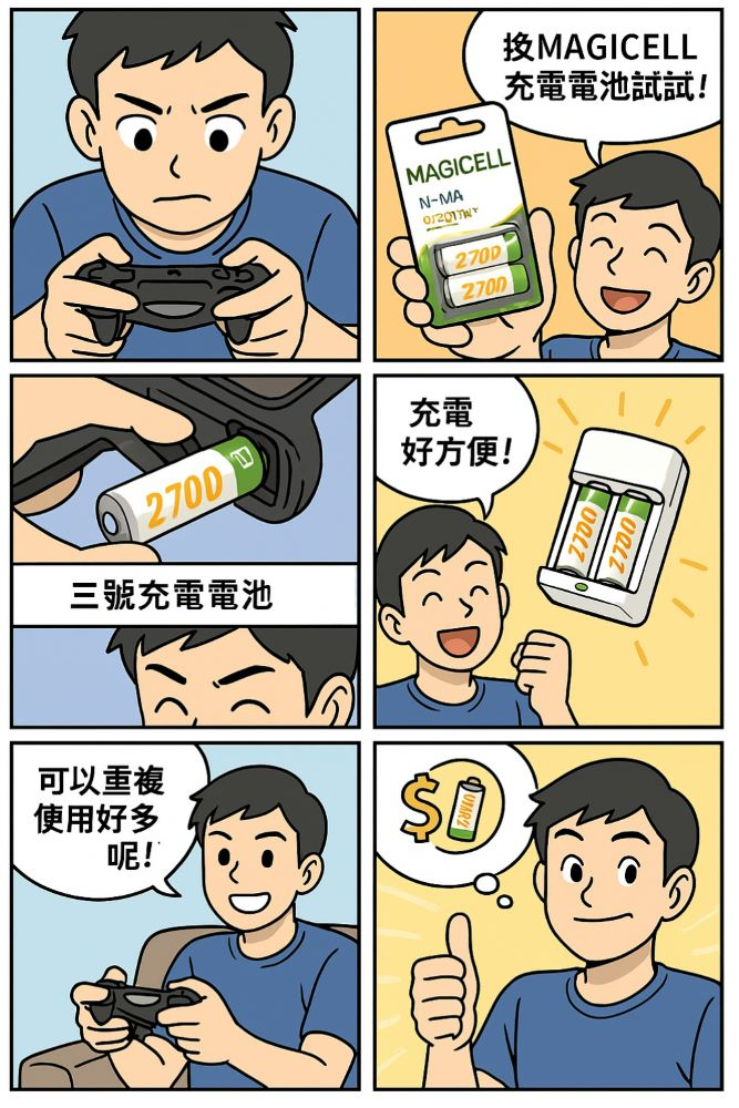 直到他發現 電池大牌MAGICELL 3號充電電池——2700mAh 的強大續航力,能充電超過 1000 次,比他的耐心還要長!🔄🔋