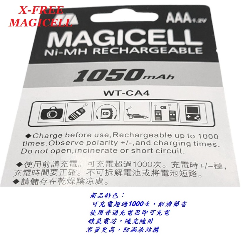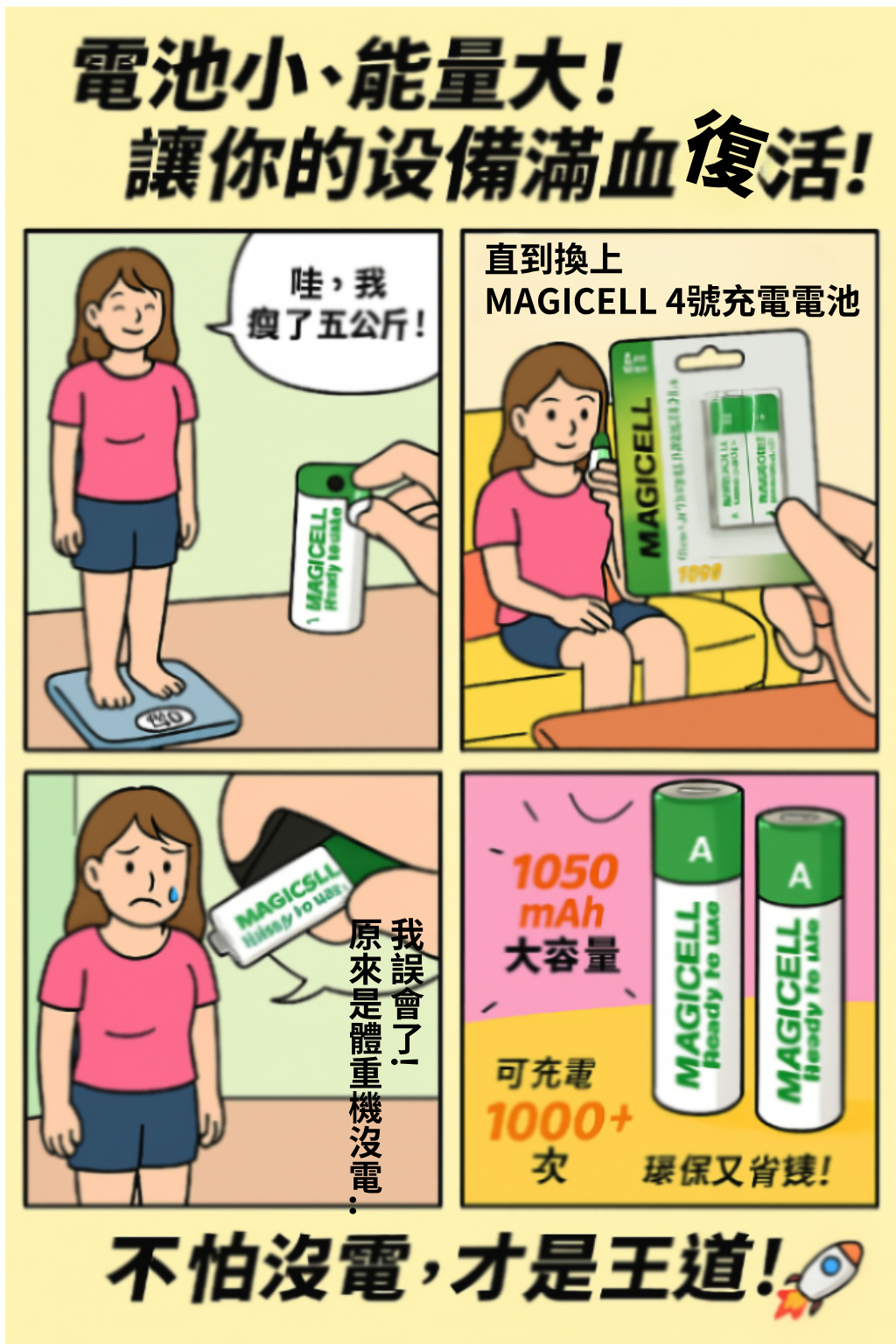 別讓沒電耽誤你的生活!MAGICELL 4號充電電池 (AAA),1050mAh 大容量,續航持久,可充電 1000+ 次,環保又省錢!✨🔄