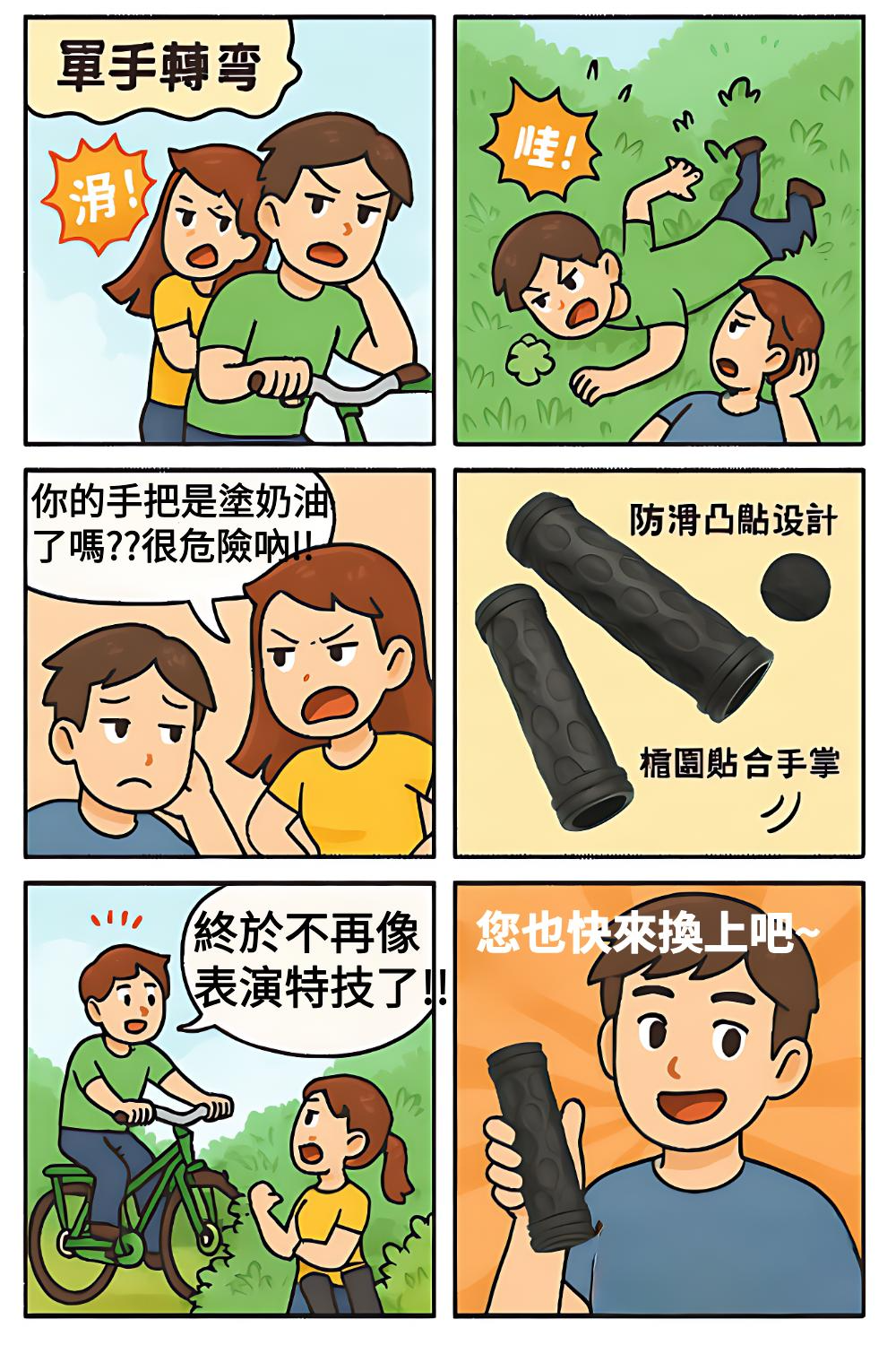 從此,阿傑痛定思痛,換上橢圓凸點自行車手握,抓握穩定不滑手!💪