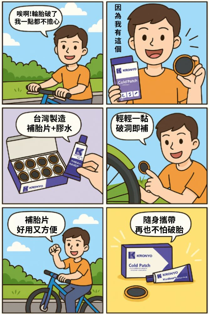 3️⃣ 這時,一位神秘騎士現身:「少年,你缺的是這個!」(遞出 KRONYO 補胎片)