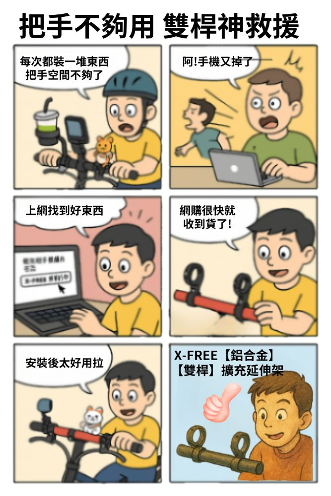 小明在網路搜尋到神物:「X-FREE 雙桿擴充架!」