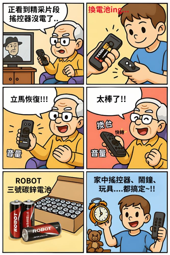 孫子偷偷換上「ROBOT 三號碳鋅電池」,電力立刻滿滿復活!