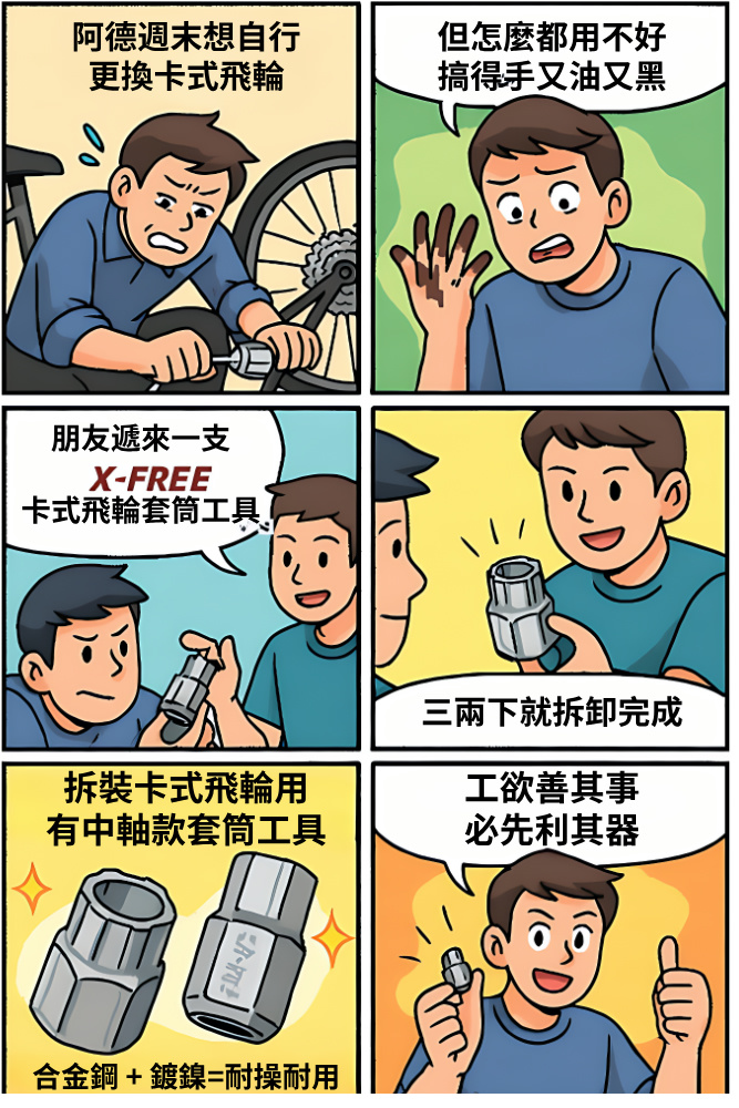 「這種小工具,差一點就差很多!」朋友遞來一支【X-FREE 卡式飛輪套筒工具】。