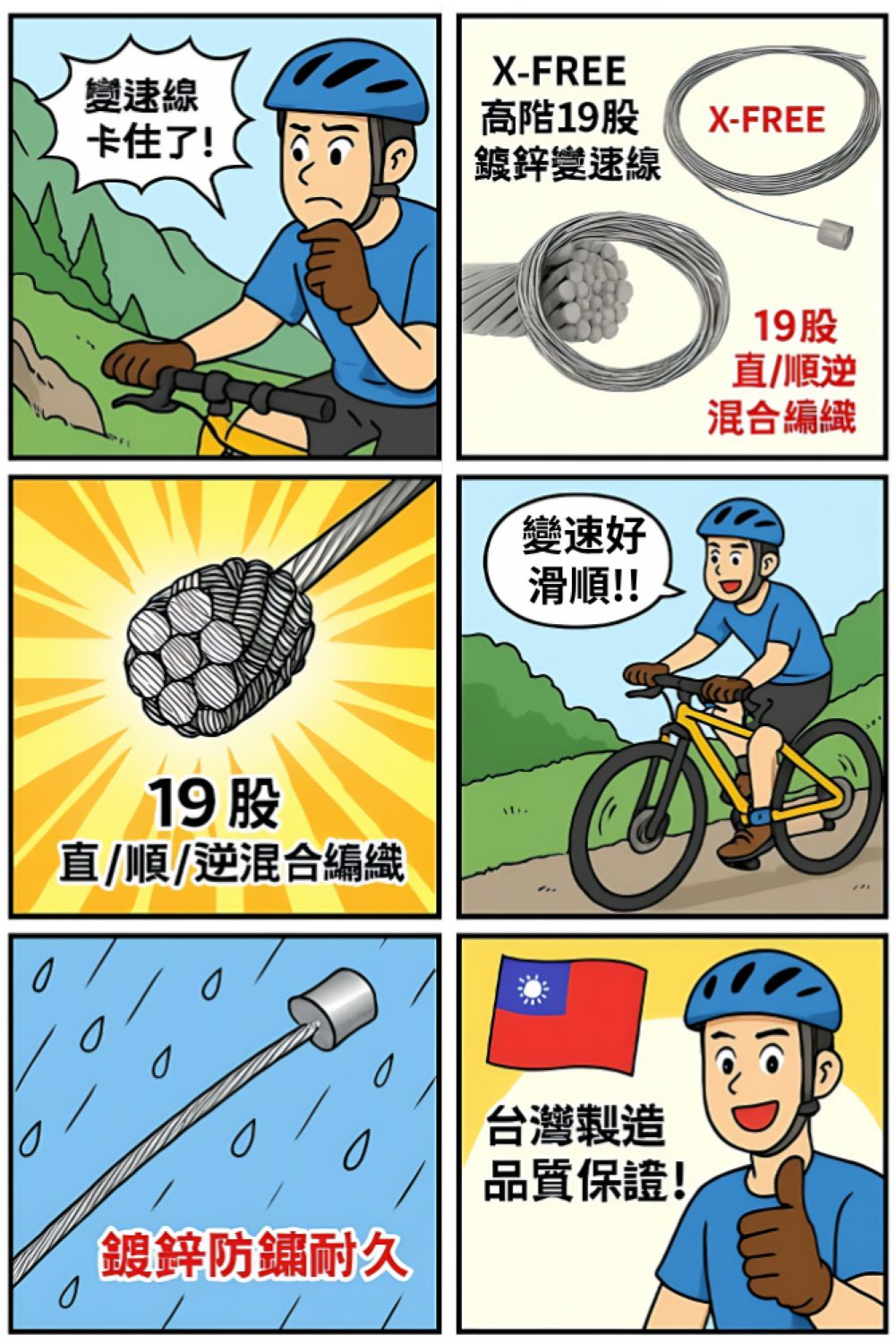 💡 他換上了【X-FREE高階19股鍍鋅變速線】,直、順、逆混合編織,穩定又滑順,讓變速如絲般順暢。