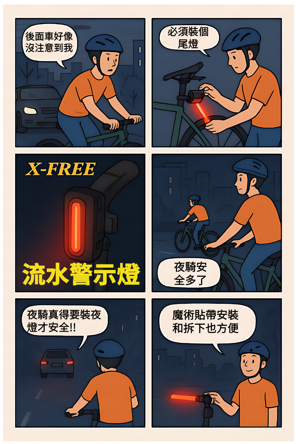 直到有一天,他裝上了 X-FREE【流水】警示燈。那條鮮紅的流水光帶,像流動的守護神,