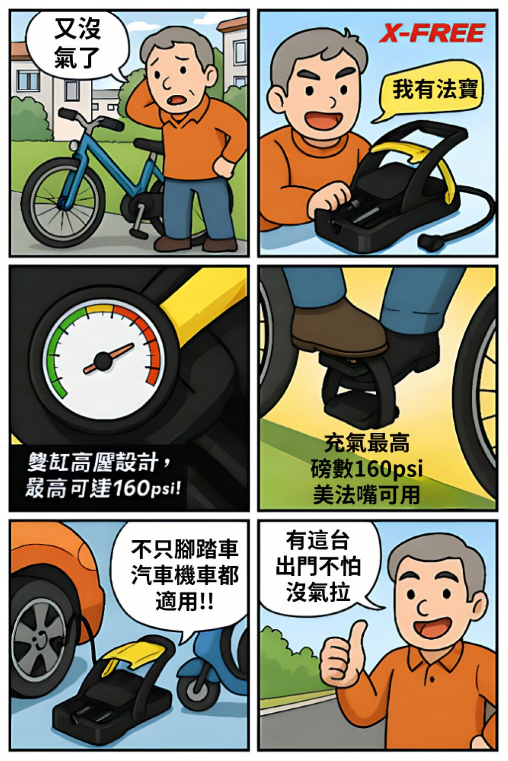 這時,他想起剛買的 X-FREE高階腳踩式雙缸高壓打氣筒!