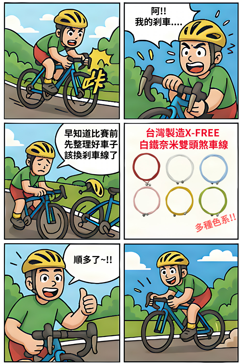 他換上【台灣製造X-FREE 白鐵奈米雙頭煞車線】後,再也不擔心剎車不靈。