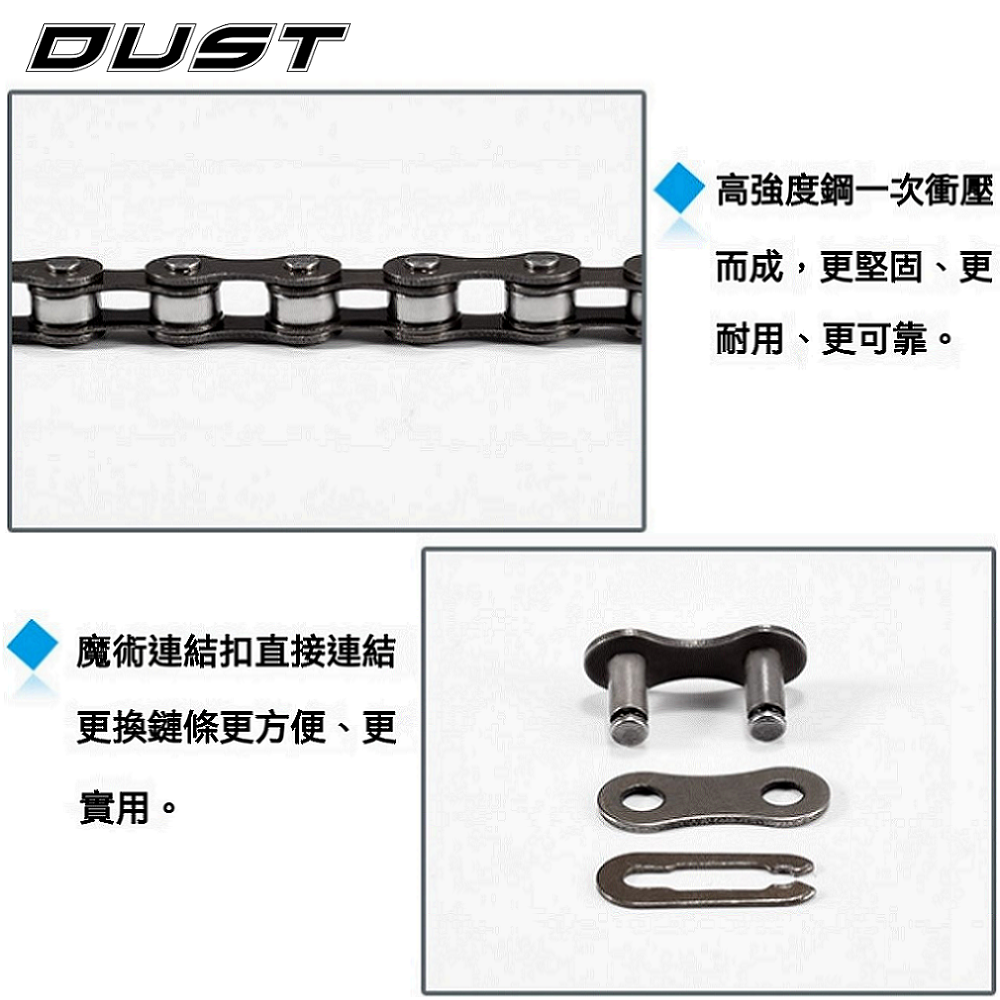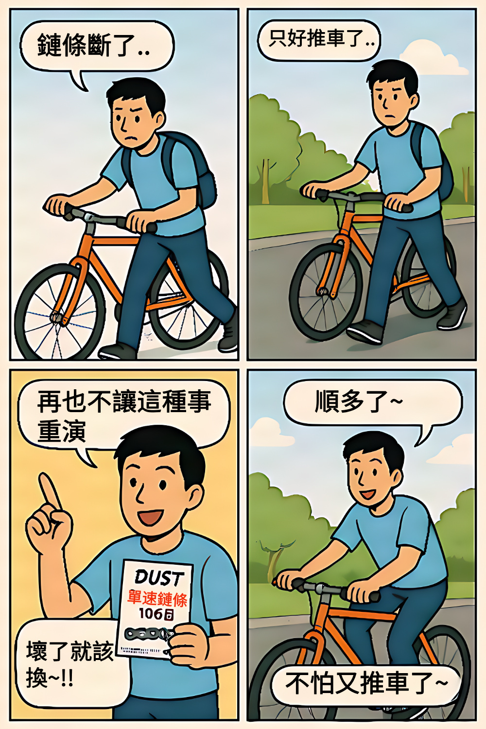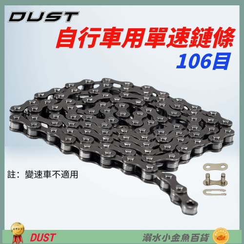 直到他換上 DUST 單速鏈條 106目,附快扣,鏈條運轉順暢不卡頓。