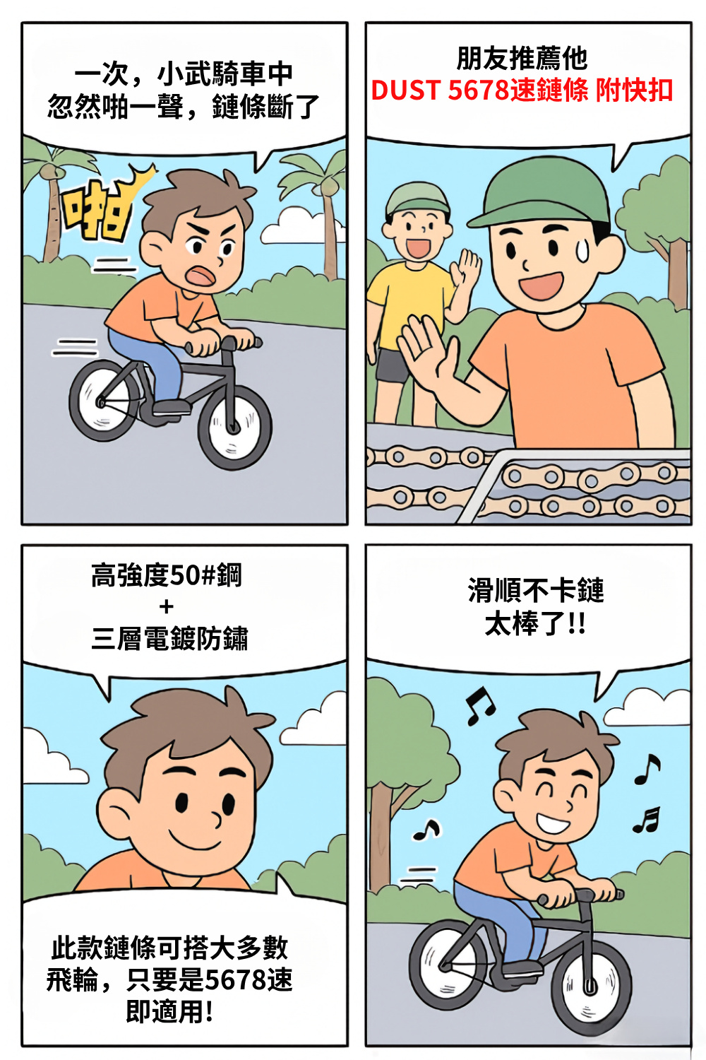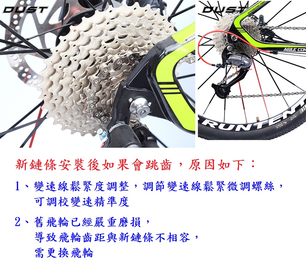 後來他換上 DUST 5678速銀鏈條,還附快扣,適用大多數飛輪(5678速)。