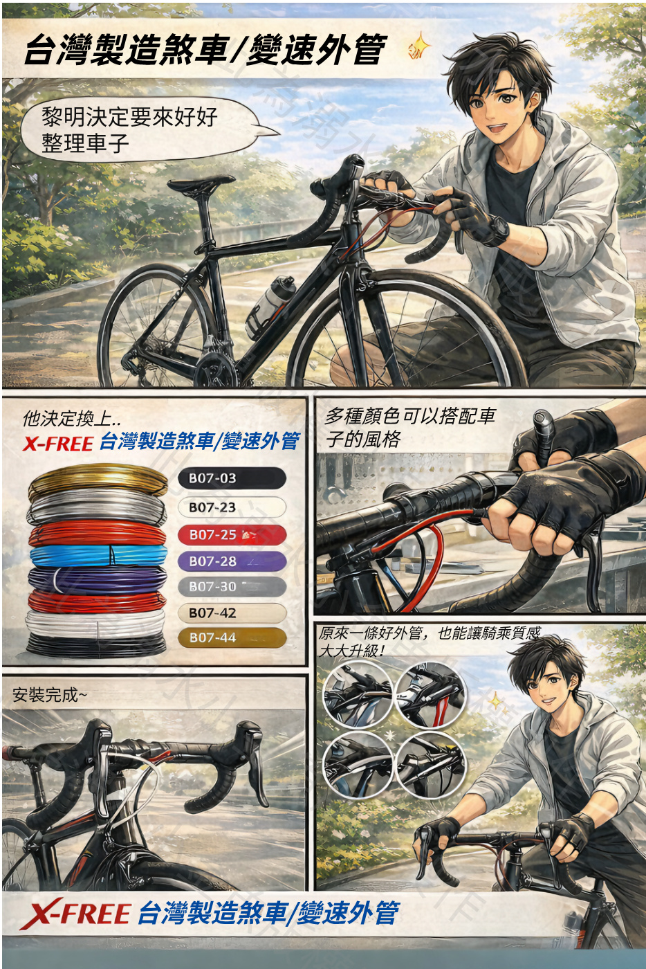 於是他決定升級成 X-FREE 台灣製造煞車/變速外管【2P螺旋式款】。