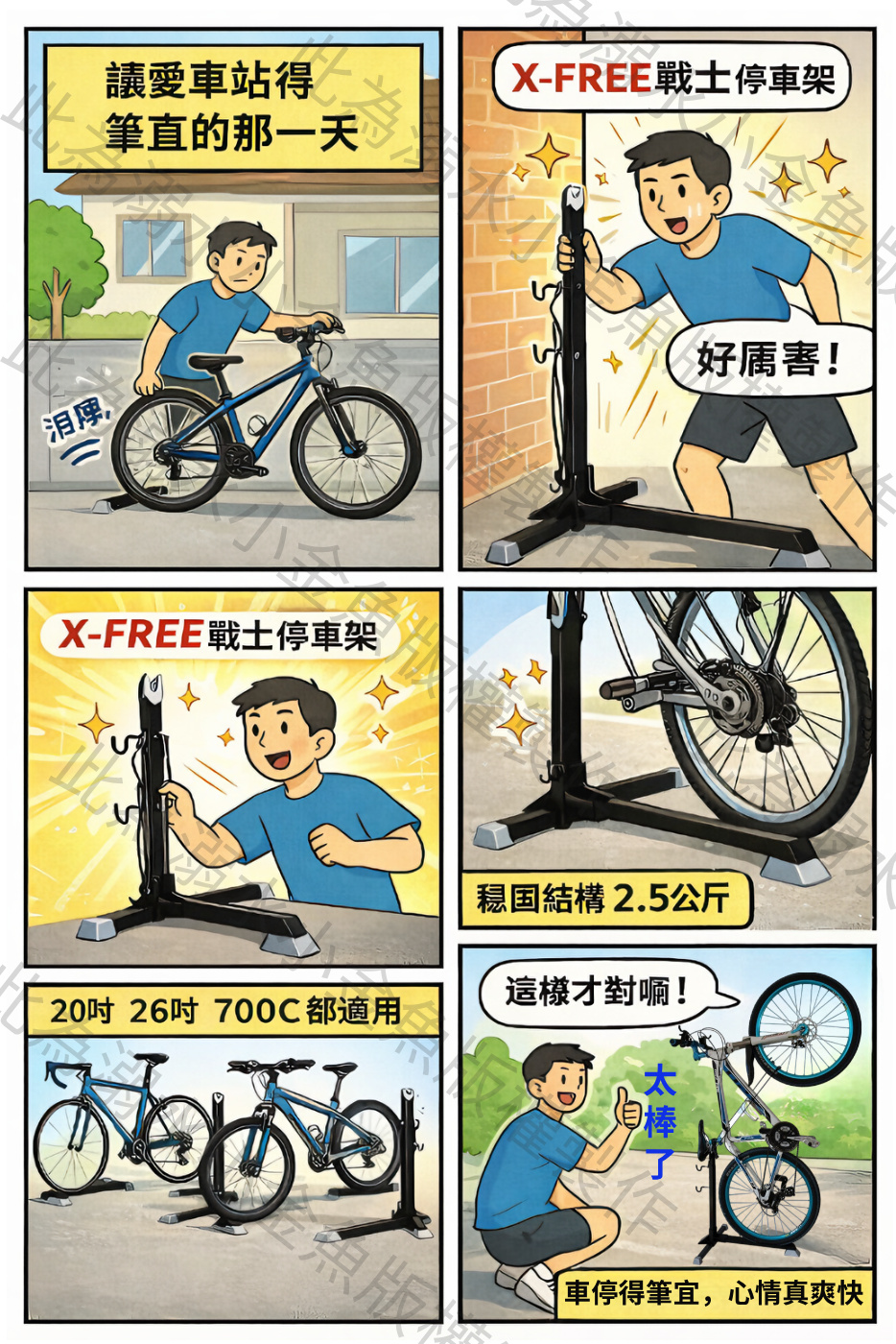 直到他裝上 X-FREE 戰士停車架,鋁合金與鋼鐵結構一落地,穩得像守護騎士。