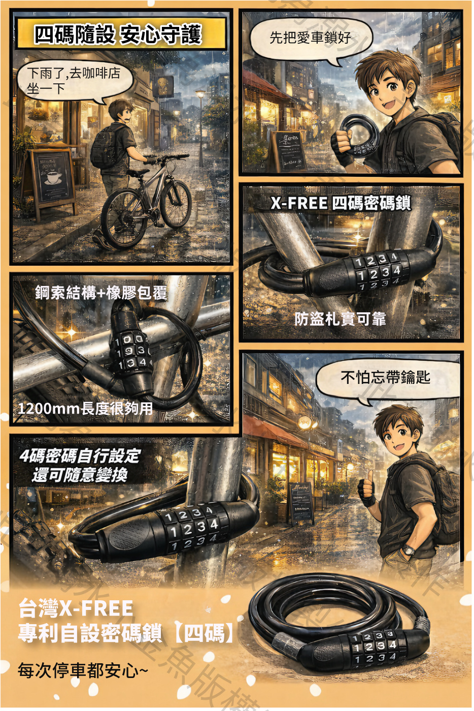 輕巧取出 X-FREE 四碼自設密碼鎖,順手一繞、一扣,動作俐落又安心。