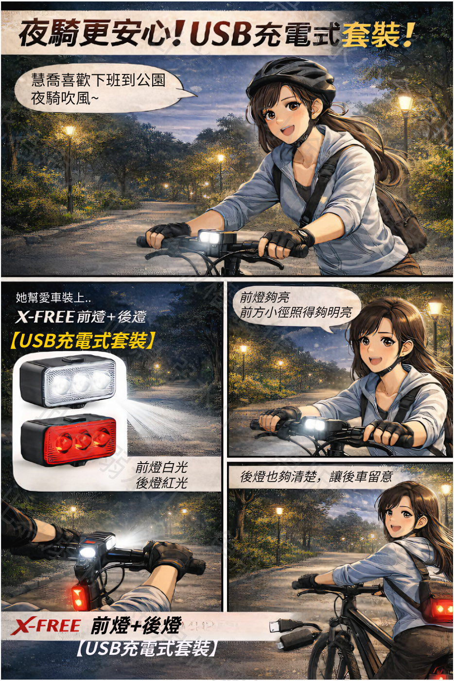 於是她幫愛車裝上 X-FREE 前燈+後燈【USB充電式套裝】。