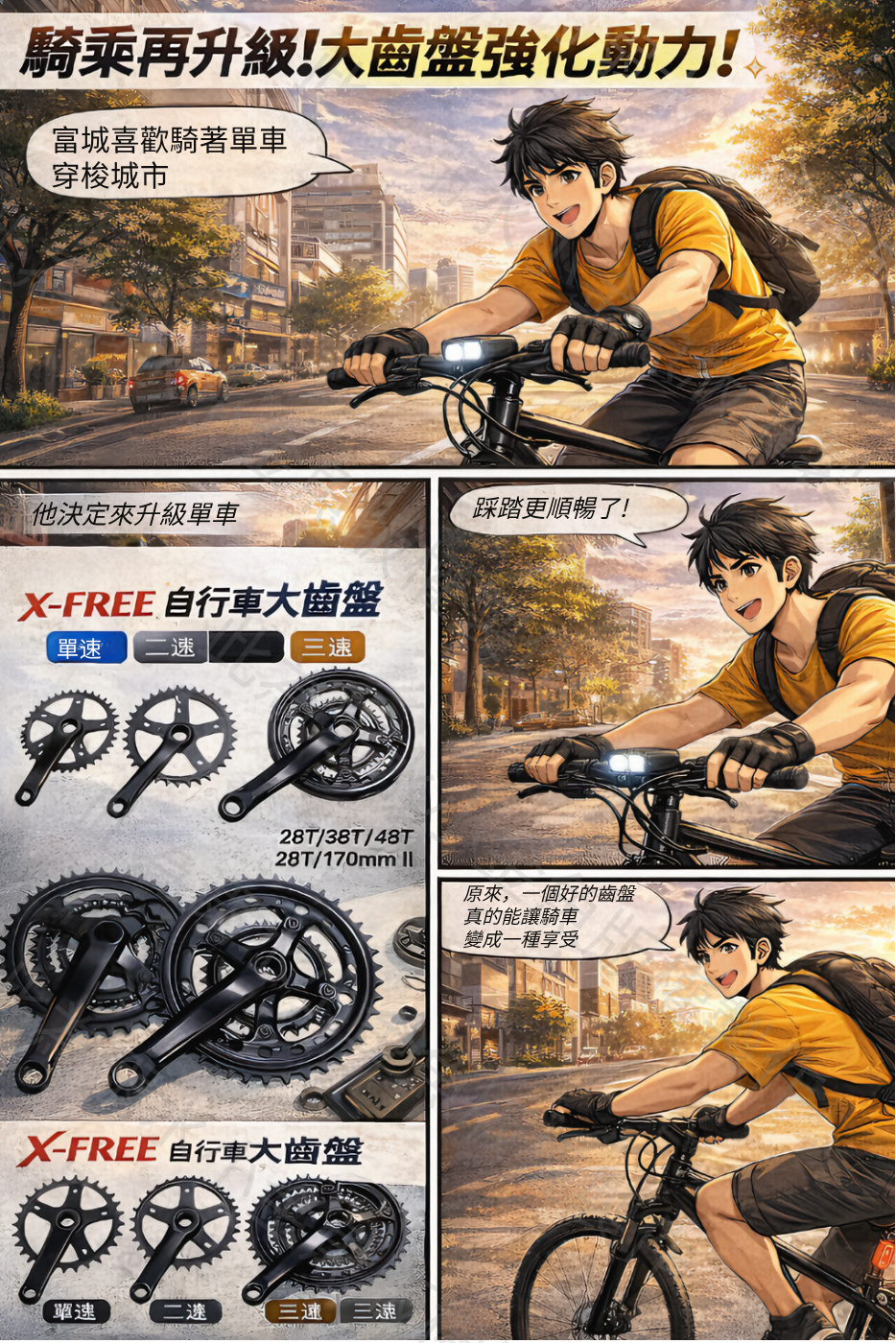 於是他換上了 X-FREE自行車大齒盤,鋼鐵結構讓踩踏變得更穩定有力。
