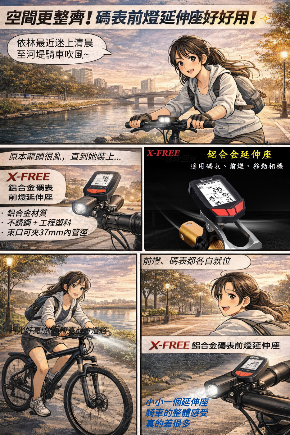 後來她裝上了 X-FREE 鋁合金碼表前燈延伸座,把前燈和碼表整齊地延伸固定在前方。