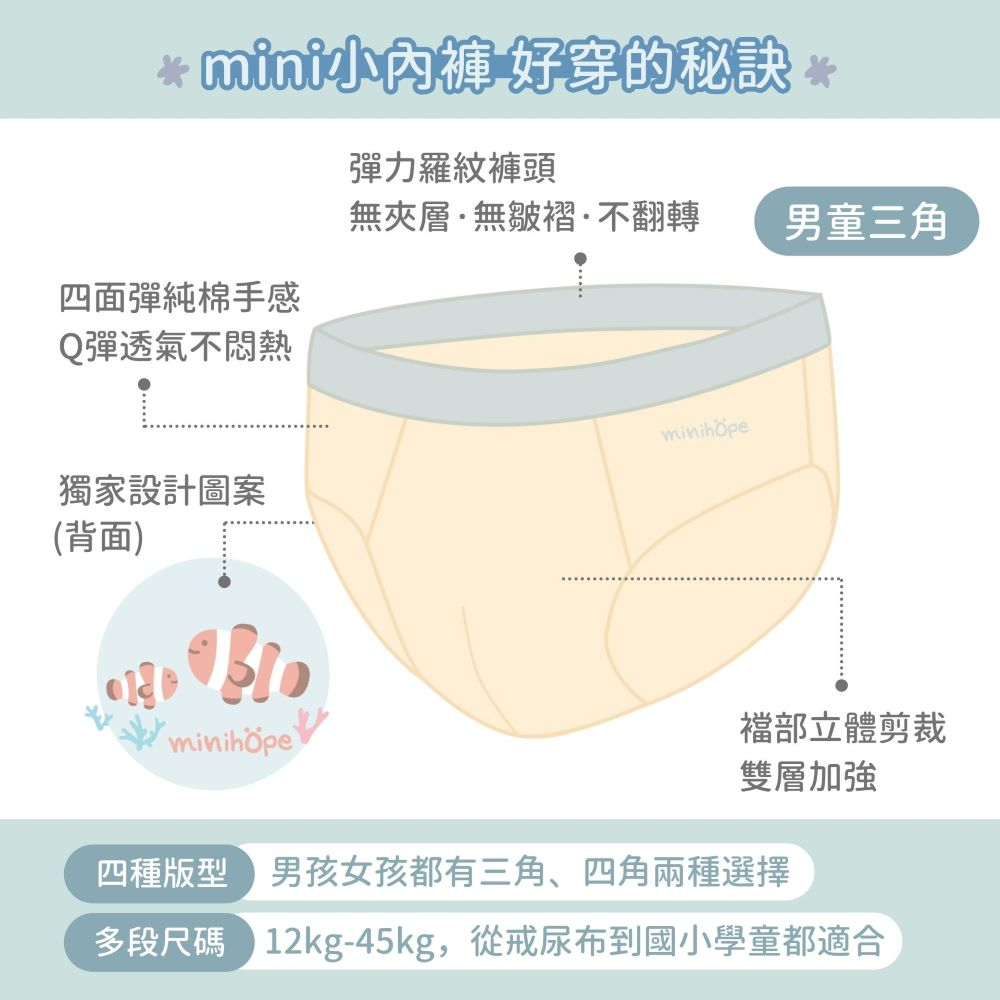minihope新品沉靜海洋動物系列熱鬧登場~四面彈材質、舒適不卡屁屁;彈性羅紋褲頭、不勒肚肚好舒適;親膚棉柔、底部雙層布料純棉透氣不悶熱,自在輕鬆無負擔~