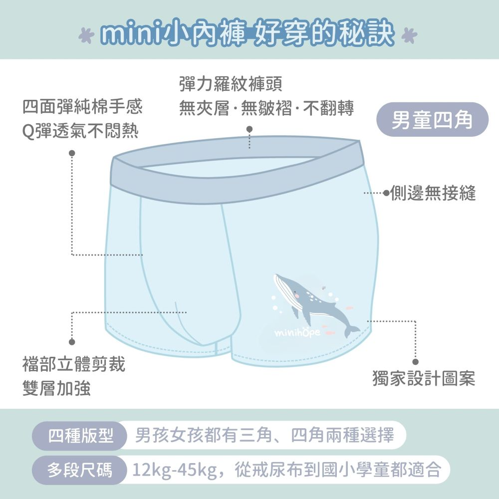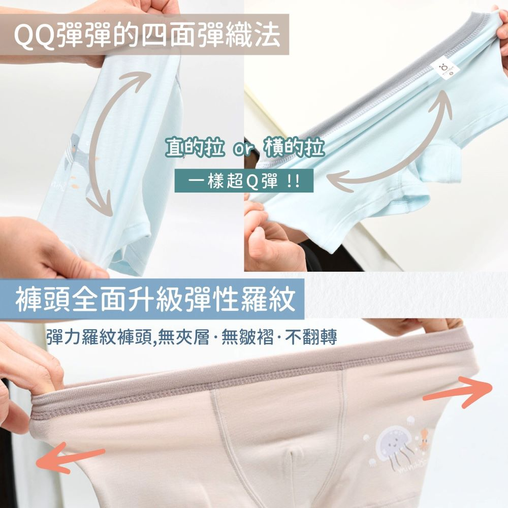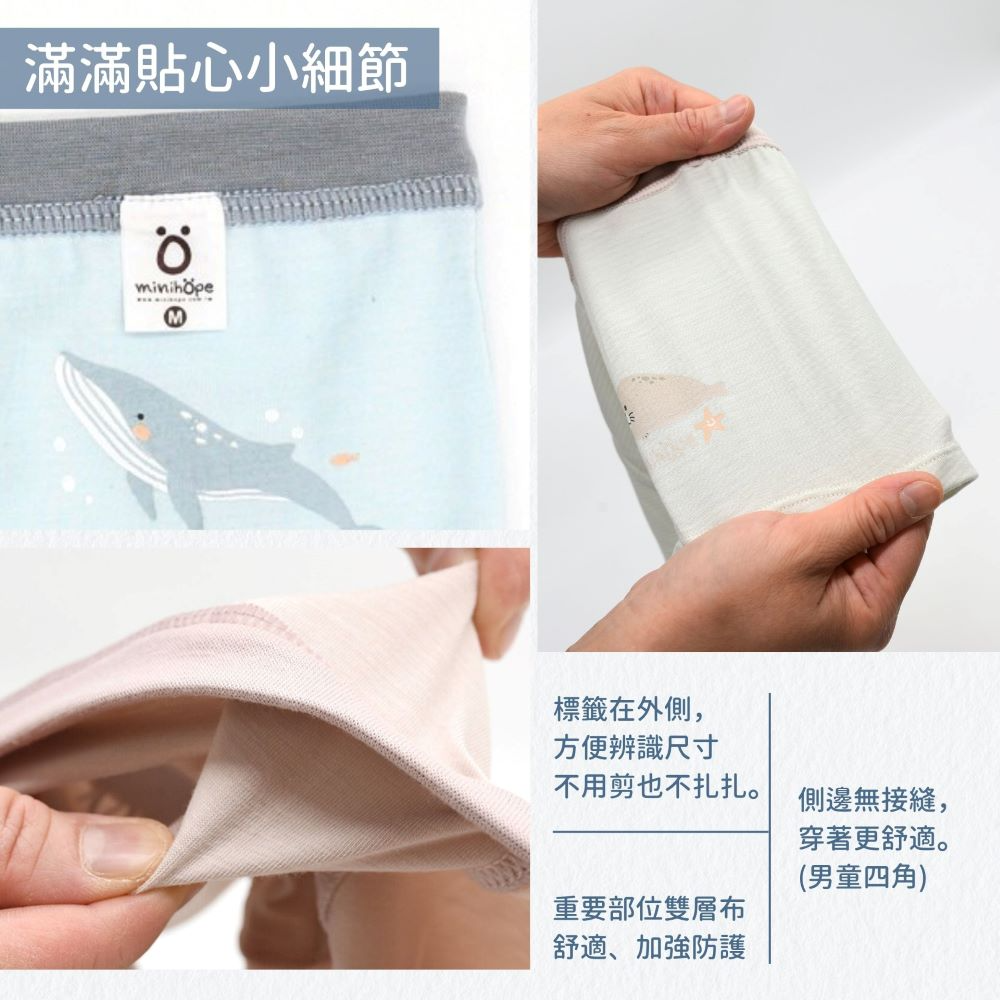 minihope新品沉靜海洋動物系列熱鬧登場~四面彈材質、舒適不卡屁屁;彈性羅紋褲頭、不勒肚肚好舒適;親膚棉柔、底部雙層布料純棉透氣不悶熱,自在輕鬆無負擔~