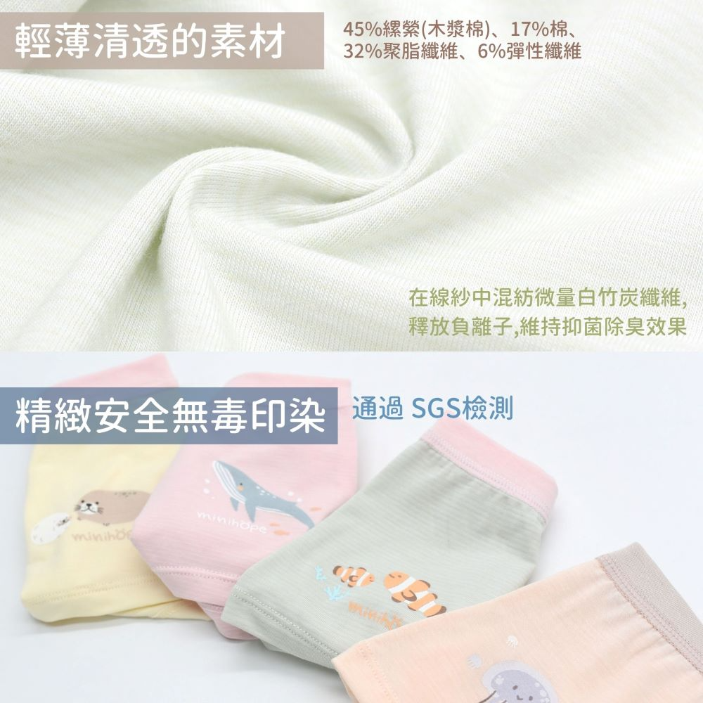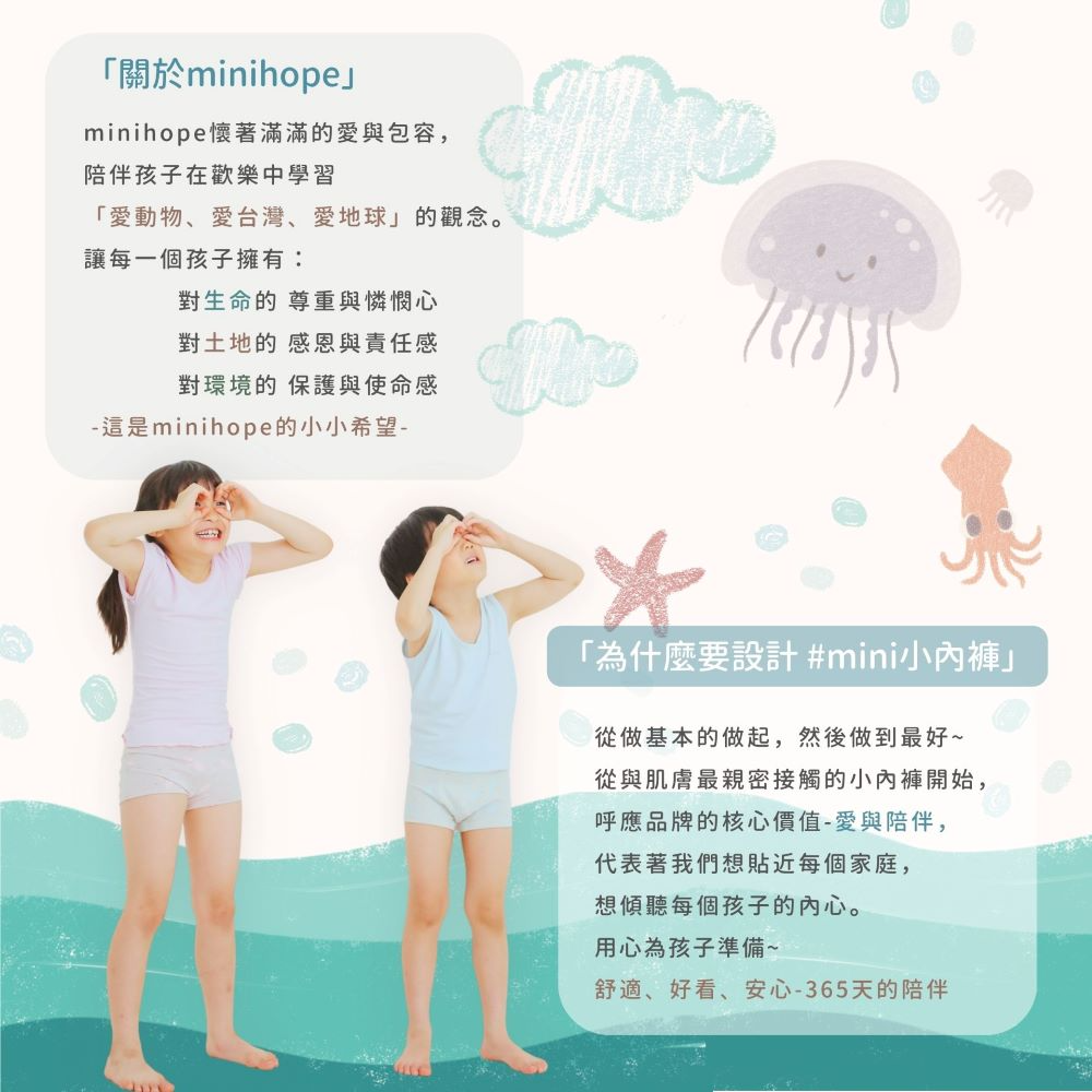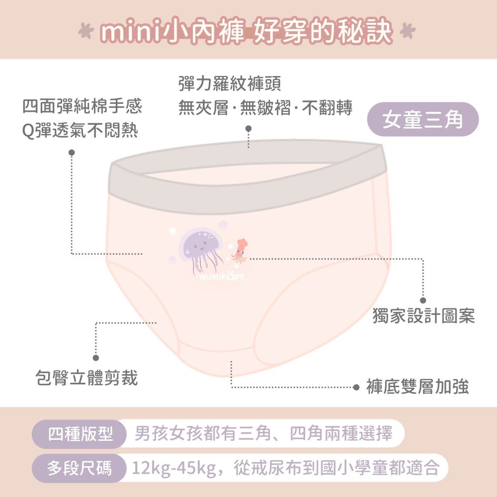 minihope新品沉靜海洋動物系列熱鬧登場~四面彈材質、舒適不卡屁屁;彈性羅紋褲頭、不勒肚肚好舒適;親膚棉柔、底部雙層布料純棉透氣不悶熱,自在輕鬆無負擔~
