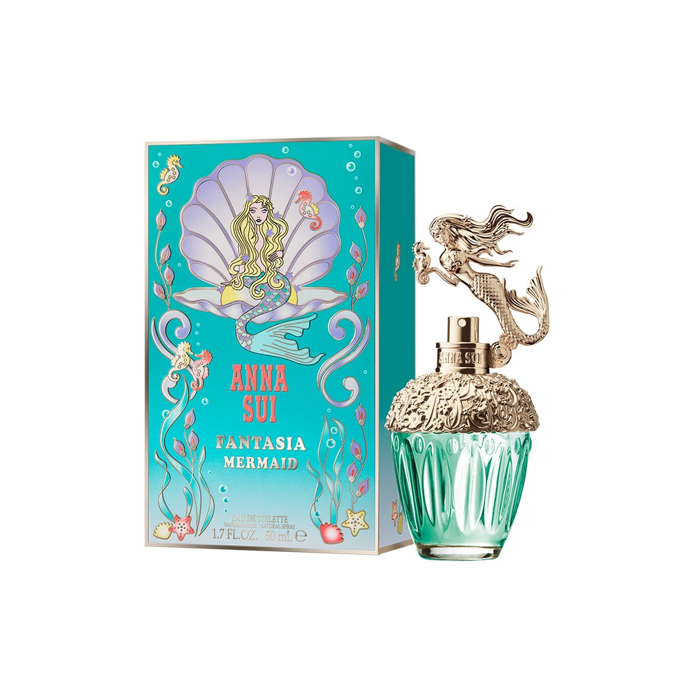 Anna Sui 童話美人魚淡香水的拋光水晶瓶中承載滿滿地藍綠色汁液,折射著海洋的粼粼波光,葉子和花朵圖樣刻烙在香檳玫瑰金瓶蓋上。聰慧的美人魚公主向海星朋友呢喃細語地訴說其中秘密。而呈現海洋風情的青碧綠外盒上,海星和海馬環繞著童話美人魚,精緻金屬銀邊折射倒映出海底宮殿的千變萬化,美人魚公主棲息在薰衣草色貝殼上,優雅帶點俏皮趣味。